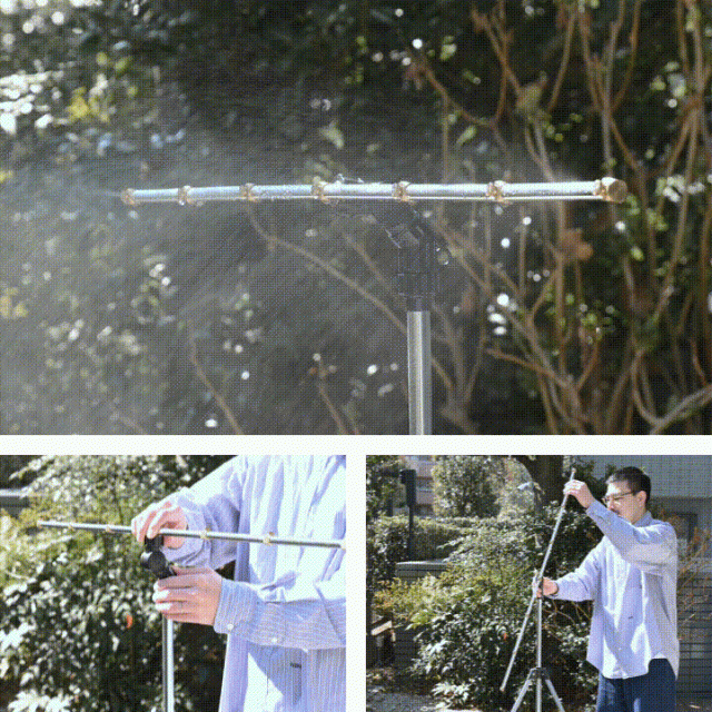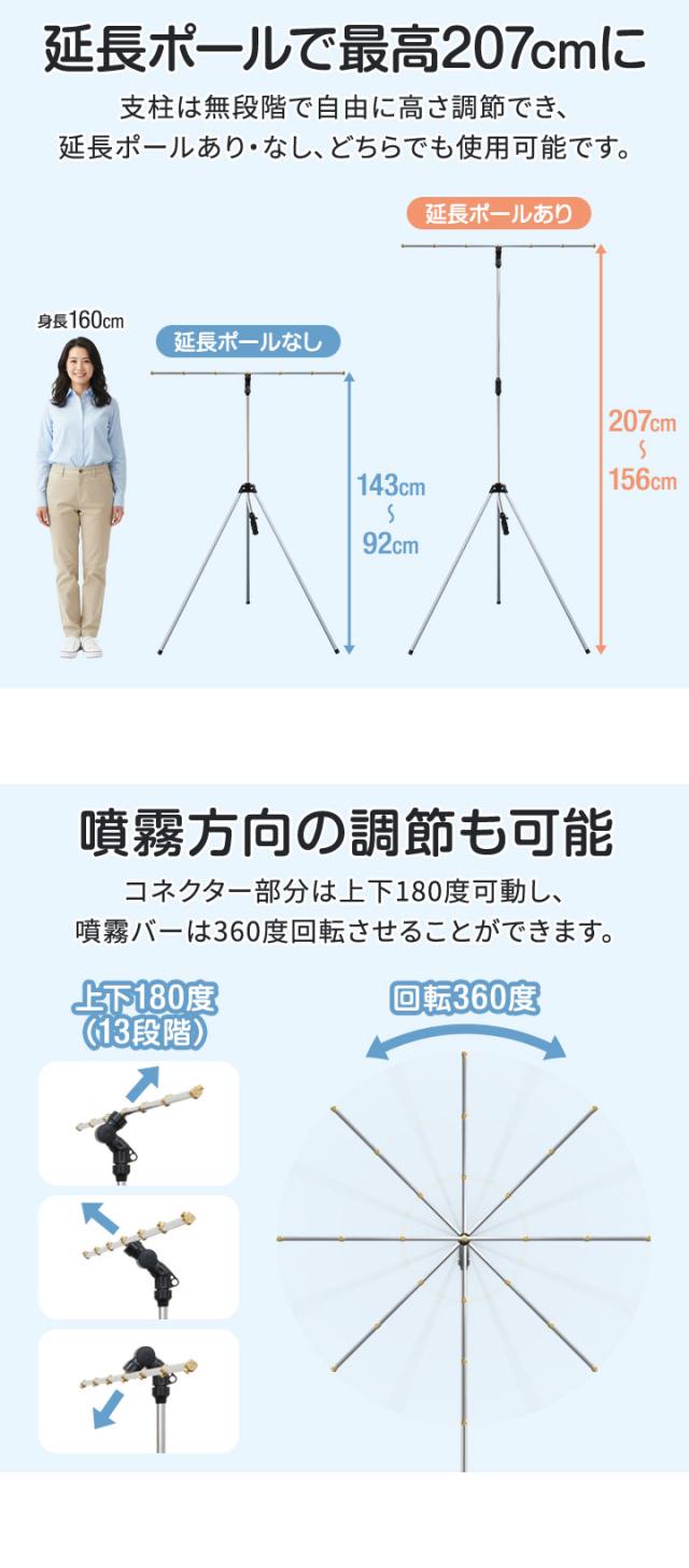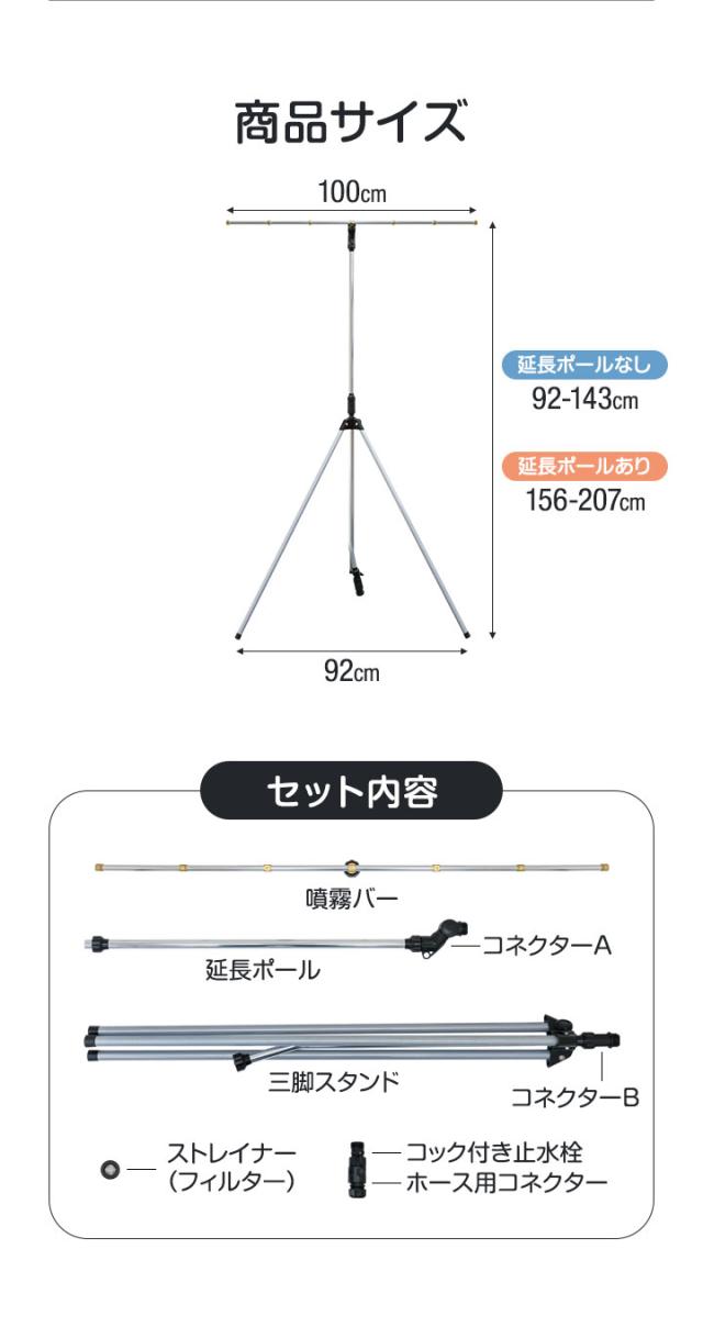 | サイズ: 噴霧バー : (約)幅100cm 延長ポールなしの高さ : (約)92cm〜143cm 延長ポールありの高さ : (約)156cm〜207cm 三脚間隔 : (約)92cm |