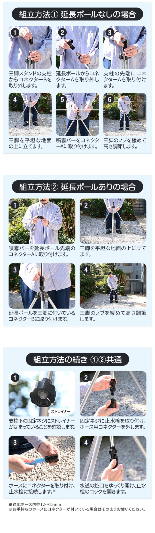 | 特記事項: ※本製品は家庭用の上水道専用です。井戸水、海水、雨水などを使用すると故障の原因となります。 ※水道を全開にすると破損する場合があります。また、水圧が低すぎるとミストが出ない場合があります。 ※お手持ちのホースにホース用コネクター(アタッチメント)が付いていない場合は、付属のホース用コネクターを取り付けて使用してください。(適応ホース内径12〜15mm) ※ホースは付属しておりません。 ※風の強い日は、三脚スタンドに重し(目安は2Lペットボトル2本まで)を吊るしたり、重心を下げることで本体を安定させて転倒を防止することができます。 ※収納時は、しっかりと水を抜き、十分乾燥させてから収納してください。 |