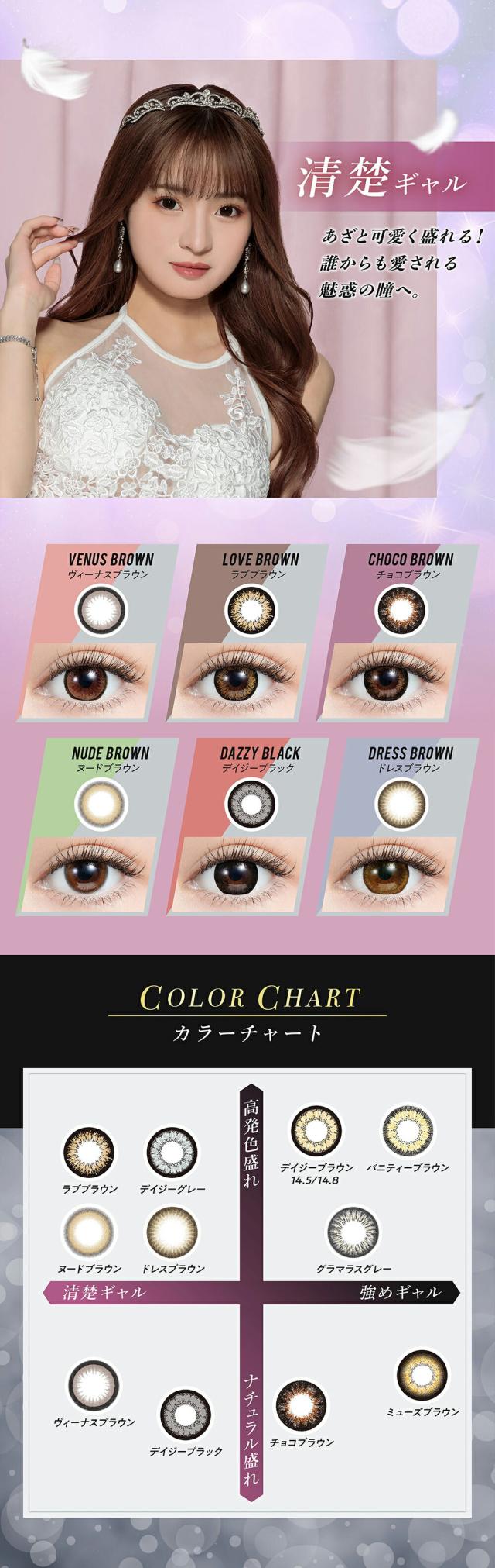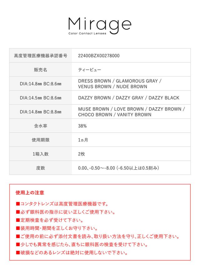 ●使用期間開封後1ヶ月●内容1箱2枚入り●含水率38.0%●度数±0.00 -0.50〜-6.00(0.25STEP) -6.50〜-8.00(0.50STEP)●BC8.6mmDIA14.5mm:デイジーブラック/デイジーグレー/デイジーブラウン14.5DIA14.8mm:ヌードブラウン/ドレスブラウン/グラマラスグレー/ヴィーナスブラウン●BC8.8mmDIA14.8mm:ミューズブラウン/ラブブラウン/チョコブラウン/デイジーブラウン14.8/バニティブラウン●DIA14.5mm:デイジーブラック/デイジーグレー/デイジーブラウン14.514.8mm:ヌードブラウン/ドレスブラウン/グラマラスグレー/ヴィーナスブラウン/ミューズブラウン/ラブブラウン/チョコブラウン/デイジーブラウン14.8/バニティブラウン●着色直径13.9mm:ヌードブラウン/デイジーブラック/デイジーグレー/デイジーブラウン14.514.0mm:ヴィーナスブラウン/チョコブラウン/ドレスブラウン/グラマラスグレー14.2mm:ラブブラウン/ミューズブラウン/デイジーブラウン14.8/バニティブラウン●生産国韓国●製造販売元PIA株式会社●販売名ティービュー●医療機器承認番号22400BZX00278000