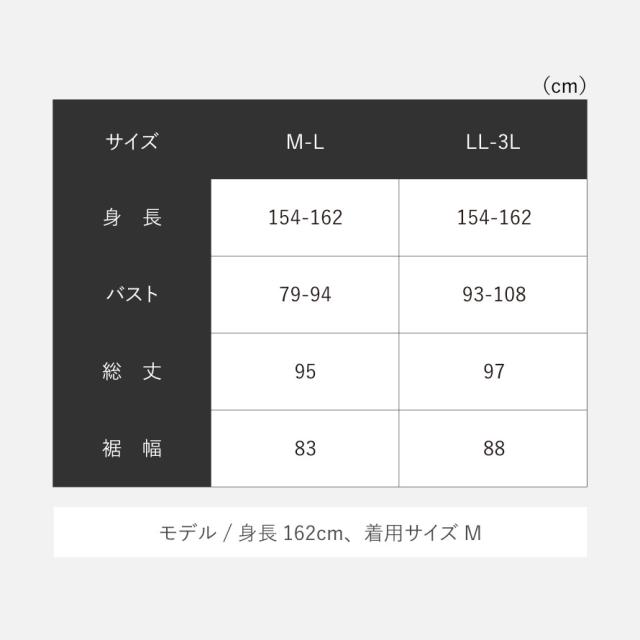 ■サイズ:身長154-162、M-L/バスト79-94、総丈95、裾幅83、LL-3L/バスト93-108、総丈97、裾幅88cm