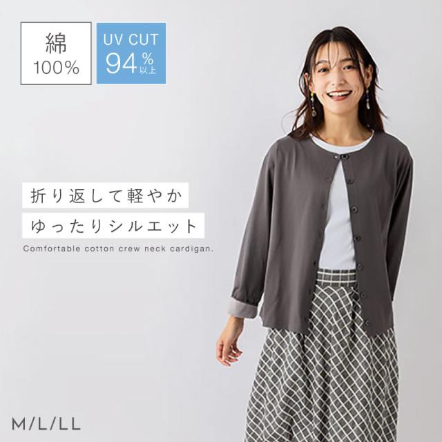 カーディガン レディース 春 ドロップショルダー 袖 ゆったり 綿100% uvカット 長袖 クルーネック ポケット付き 綿100%UVクルーネックカーディガン M L LL 大きいサイズ ゆったり 体型カバー 40代 50代 60代 70代 メール便対応