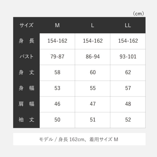 ■サイズ:身長154-162、M/バスト79-87、身丈58、身幅53、肩幅46、袖丈50、L/バスト86-94、身丈60、身幅55、肩幅47、袖丈51、LL/バスト93-101、身丈62、身幅57、肩幅48、袖丈52cm