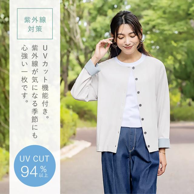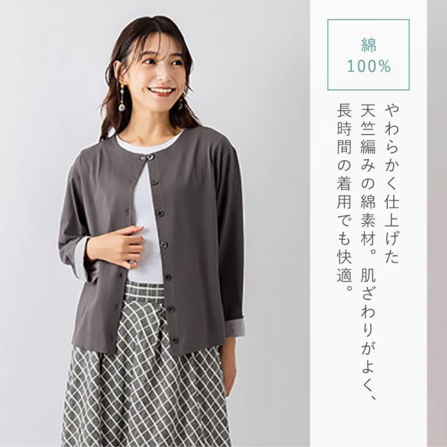 素材はやわらかく仕上げた天竺編みの綿100%。肌ざわりがよく、長時間の着用でも快適にお過ごしいただけます。さらにUVカット機能付きで、UV遮蔽率94%以上。紫外線が気になる季節にも心強い一枚です。