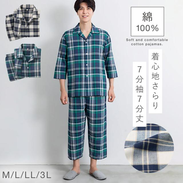 パジャマ メンズ 綿100% パジャマ 男性 前開き 春 夏 七分袖 七分丈 チェック 上下セット 綿100%くつろぎ先染めパジャマメンズ M L LL 3L 大きいサイズ ゆったり シニア メール便対応