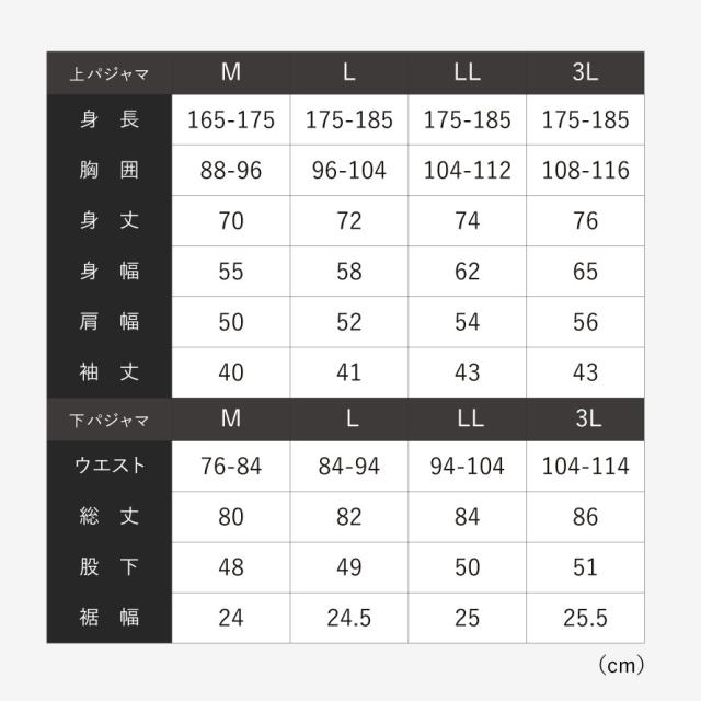 ■サイズ:M/身長165-175、胸囲88-96、身丈70、身幅55、肩幅50、袖丈40、ウエスト76-84、総丈80、股下48、裾幅24、L/身長175-185、胸囲96-104、身丈72、身幅58、肩幅52、袖丈41、ウエスト84-94、総丈82、股下49、裾幅24.5、LL/身長175-185、胸囲104-112、身丈74、身幅62、肩幅54、袖丈43、ウエスト94-104、総丈84、股下50、裾幅25、3L/身長175-185、胸囲108-116、身丈76、身幅65、肩幅56、袖丈43、ウエスト104-114、総丈86、股下51、裾幅25.5cm