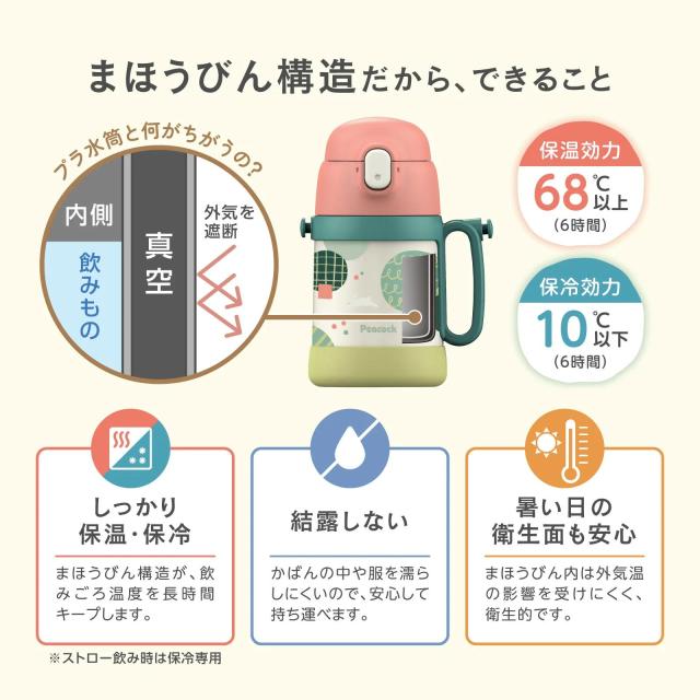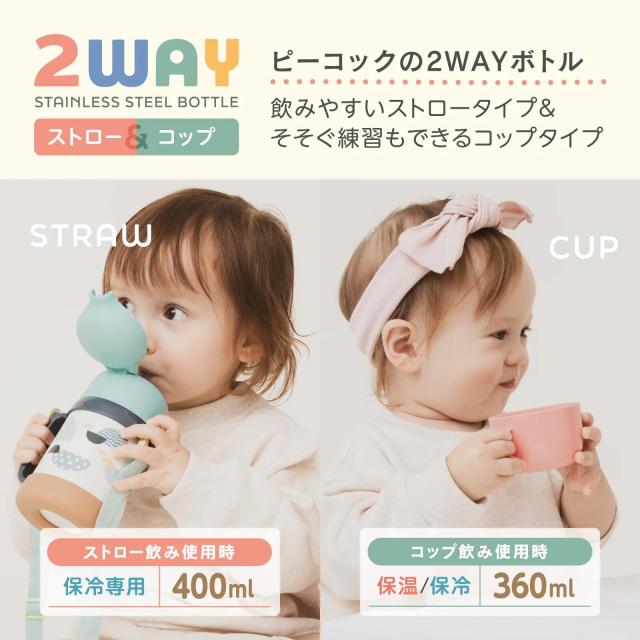 ピーコック ステンレスボトル 2WAY 水筒 400ml 360ml 真空二重 ワンタッチ ストロー コップ 直飲み 保育園 幼稚園 園児 幼児 キッズ 子ども かわいい 入園 入園準備 プレゼント 女の子 男の子 1歳 2歳 3歳 4歳 5歳 6歳 ベビー 赤ちゃん 保温 保冷 赤ちゃん 調乳 魔法瓶 ストロー付き水筒 ストローマグ お祝い プレゼント ギフト 入園祝い 入学祝い プレゼント 誕生祝い 内祝い ベビーシャワー 100日祝い ピーコック魔法瓶