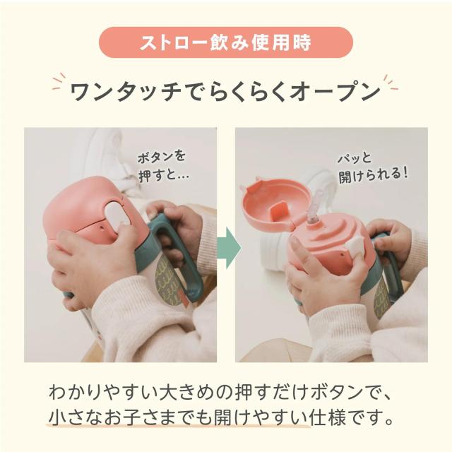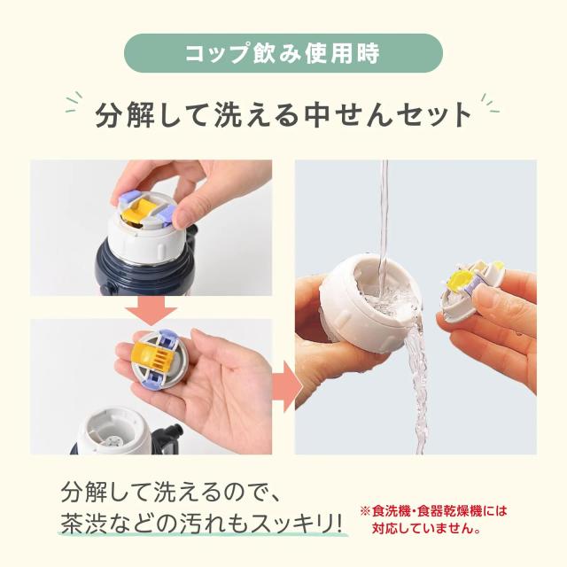 お子様の成長に寄り添う、ステップアップボトル! ● ステンレス真空断熱構造でしっかり外気温を遮断、保温と保冷効果に優れています。 ● お子様の成長に合わせてコップ飲みとストロー飲みの2種類の使い方ができます。 ● 胴部の口部口径は約4.2cmあり、飲みものや氷が入れやすくなっています。 ● コップ飲みに使う中せんは、分解できるのでしっかり中まで洗えます。 ● 胴部にハンドルが付いているので、小さな手でも持ちやすくなっています。 ● 本体の底部にシリコーン製の底カバーが付いていて瓶を傷や衝撃から守ります。 ● お出掛けに便利な長さが調節できるショルダーベルトが付いています。 ● 替えのストローが1セット付属しております。 ● 本体は丸洗いができます。 |