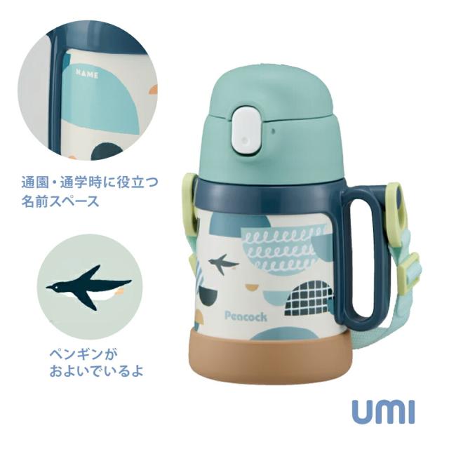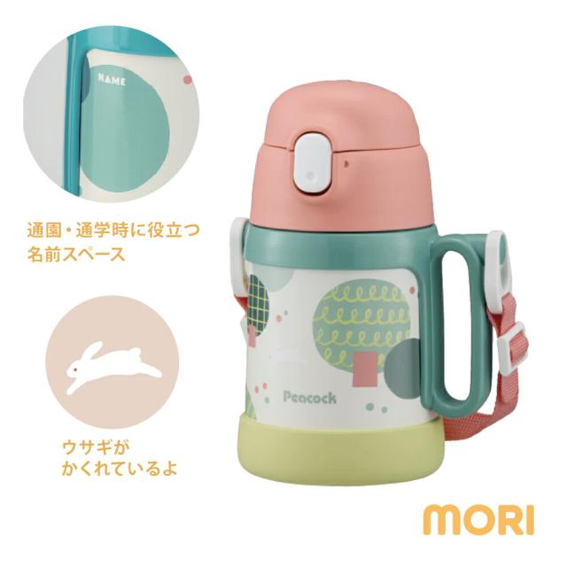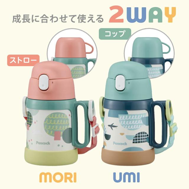 Peacock ステンレスボトル 2WAYタイプ ストロー & コップ 0.4L / 0.36L モリ ウミ ASK-W41 ストロータイプ コップ付き ベビー ストローマグ ベビーマグ 保冷 かわいい 400ml ストロー付き水筒 幼稚園 保育園 女の子 男の子 子ども ステンレス ショルダー ベルト