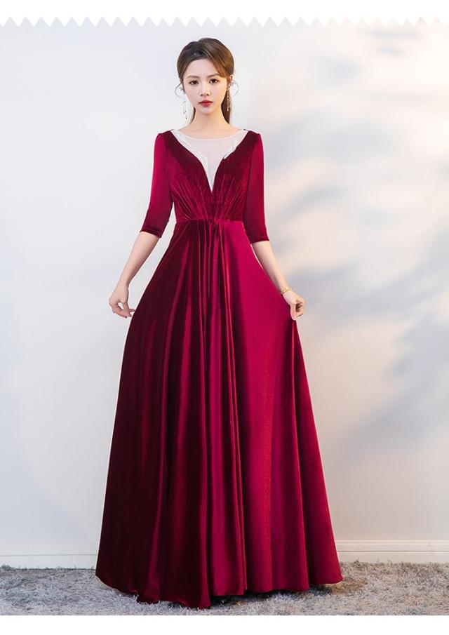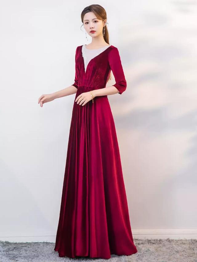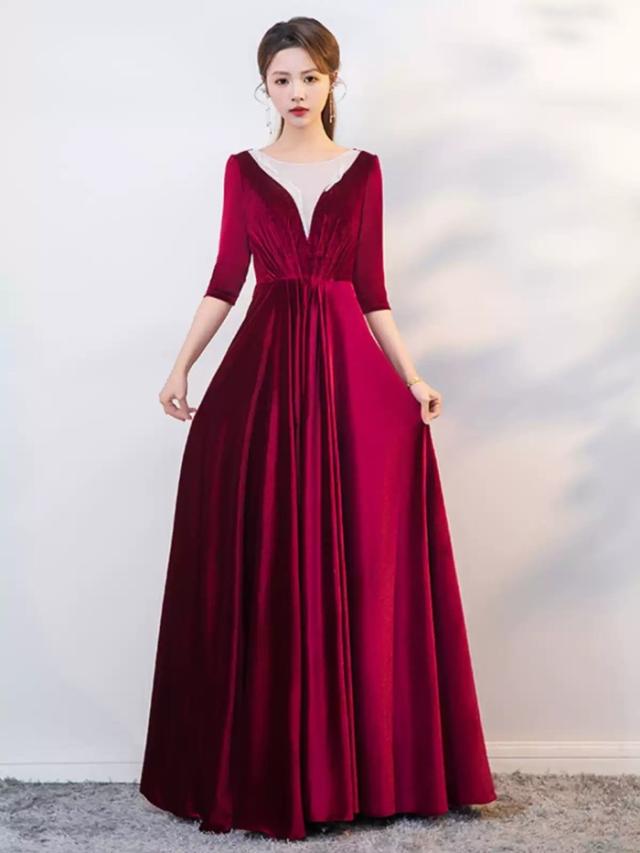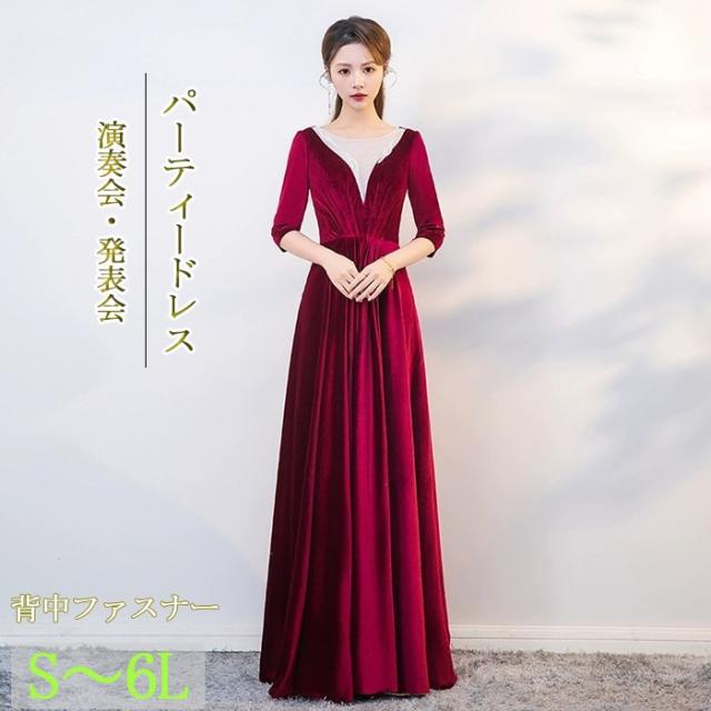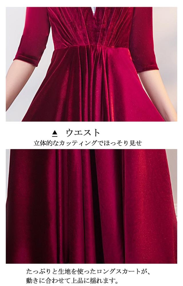 パーティードレス ロングドレス ベルベット ワインレッド 五分袖 背中ファスナー レースインナー風デザイン Aライン 上品 発表会 演奏会 合唱 団体衣装 結婚式 二次会 成人式 30代 40代 50代 S〜6L 大きいサイズ エレガント カラオケドレス dd159x0x0x7