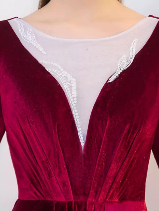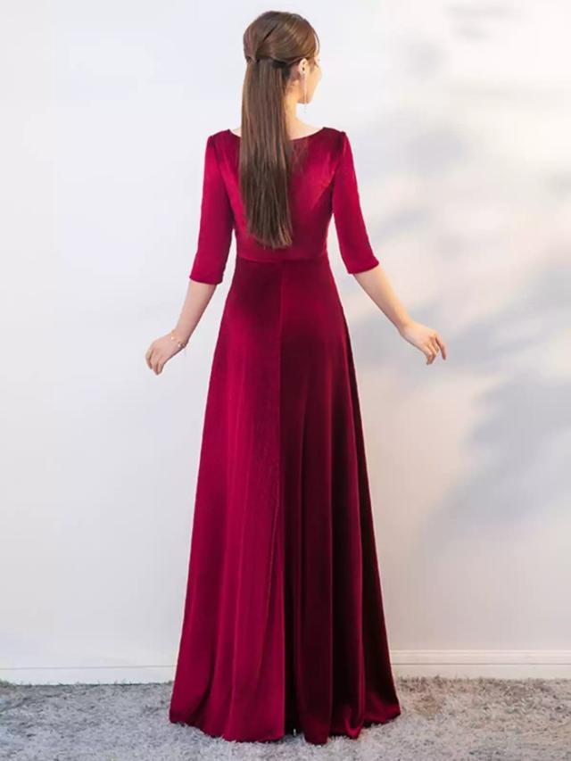 パーティードレス ロングドレス ベルベット ワインレッド 五分袖 背中ファスナー レースインナー風デザイン Aライン 上品 発表会 演奏会 合唱 団体衣装 結婚式 二次会 成人式 30代 40代 50代 S〜6L 大きいサイズ エレガント カラオケドレス