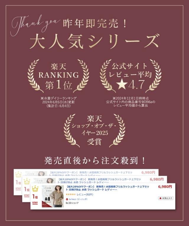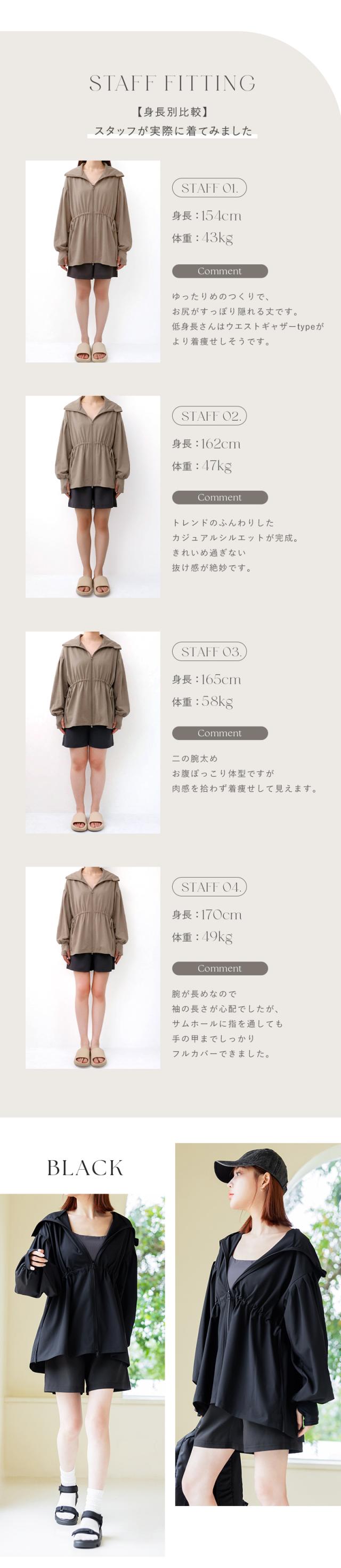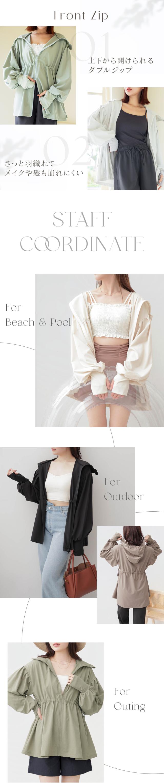 tu-hacci rash guard Collection ラッシュガード単品 シーンによって着回し抜群! 水陸両用UVカットパーカー スタイリッシュなデザインと多機能が融合した究極の一着 【こんな方におすすめ】 ・絶対日焼けしたくない ・手軽に涼しくUV対策したい ・「ちょっとそこまで」の外出も、サッと羽織るだけでサマになりたい ・気になる腰回りや二の腕を、オシャレに自然にカバーしたい ■UVカット率最大99.6%! ・鼻先まで隠れるフード設計:ドローコードを絞れば、首元から顔周りまで徹底ガード ・サムホール付きのロング袖:うっかり焼けやすい手の甲まで、隙なくしっかりカバー ■暑い日を快適に過ごす「接触冷感」 表地に施した接触冷感加工が、肌に触れた瞬間からひんやりとした心地よさ◎ ■ 公園遊びからレジャーまで、日常のあらゆるシーンに 機能的な水陸両用生地を採用 海やプールでの日焼け対策はもちろん、旅行、キャンプ、バーベキュー、屋外イベントなどアクティブな日にも大活躍 さらに、毎日の公園の付き添いやガーデニング、ちょっとした外出にも溶け込むボーダーレスな素材とデザイン ■ ママに嬉しい「高機能ディテール」 ・ダブルジップ仕様:上下の開き具合を調整して、抜け感も着心地もアレンジ自在 ・便利なポケット付き:スマホや鍵、お子様のちょっとした荷物などをサッと入れられる実用設計 ■「着痩せ設計」で、体型カバー ・ウエストギャザー:気になるお尻周りをカバーしつつ、キュッと絞られたウエストラインで女性らしい「くびれ」を演出 ・華奢見え効果:肩落ちのオーバーシルエット&フレアな袖口が、上半身を華奢見せ ラッシュガードのインナーにおすすめ ≫ 水陸両用ブラトップはこちら ≪ ≫ ギフトラッピングはこちら ≪ |