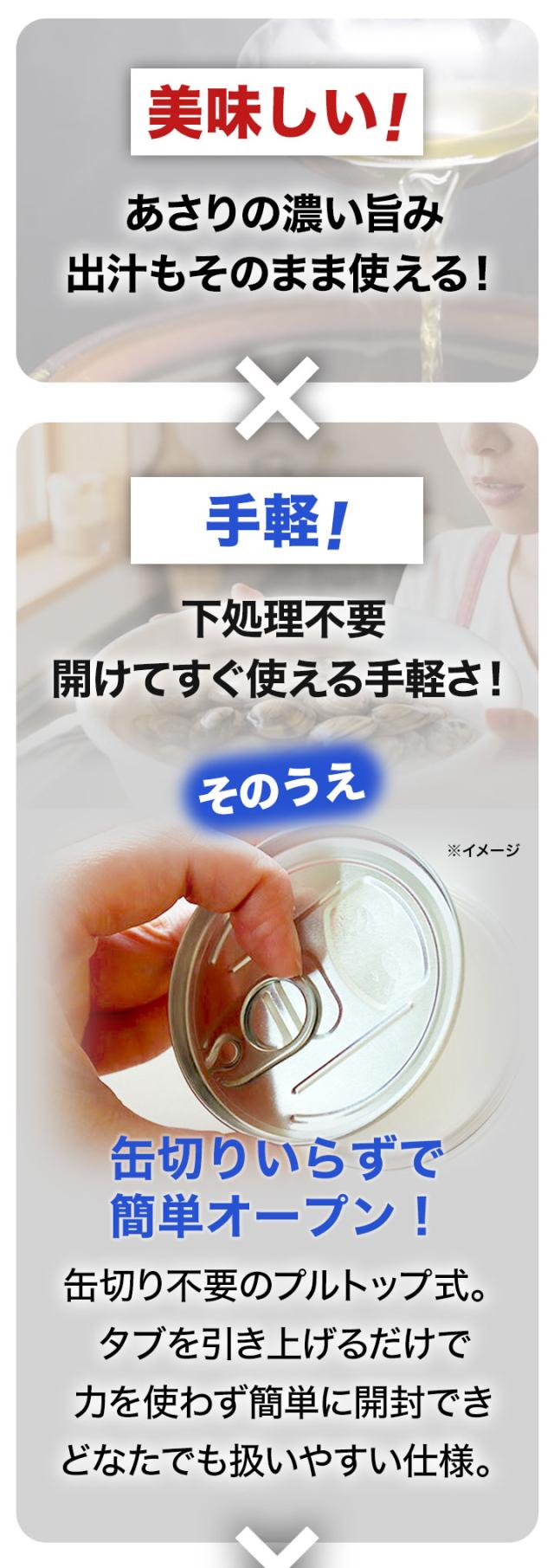 | ※缶切り不要のプルトップ式です。 ※開缶後はお早めにお召し上がり下さい。 ※食品につき配送上の破損以外の返品はご容赦ください。 ※賞味期限は未開缶で保存した場合の期限です。 開缶後は賞味期限にかかわ らず、お早めにお召し上がりください。 ※温める場合は別の容器に移して加熱してください。 ※お使い残りの出た場合は、他の容器に移し換えて冷蔵庫に入れ、お早めにお使いください。 ※あさりの成分により、あさりや缶が黒くなる場合がありますが、人体には全く無害ですからご安心ください。 |