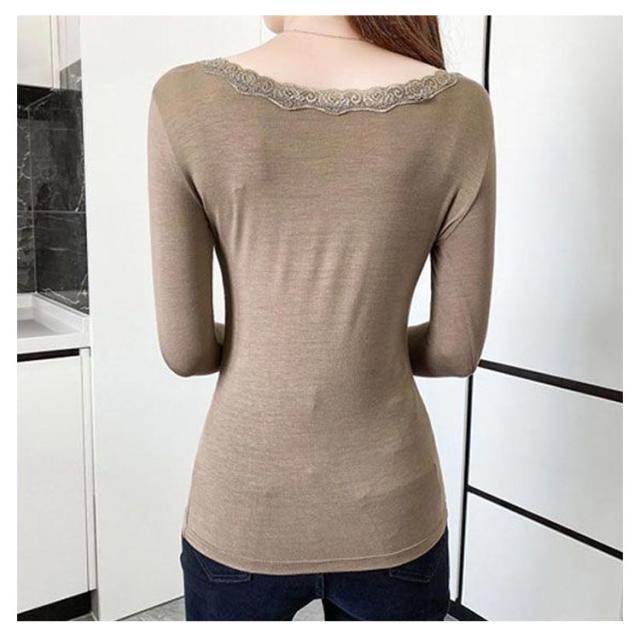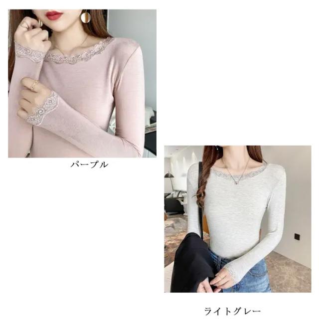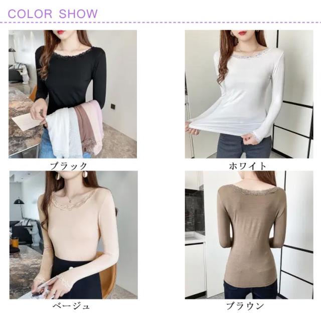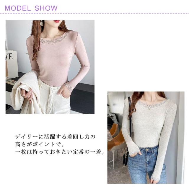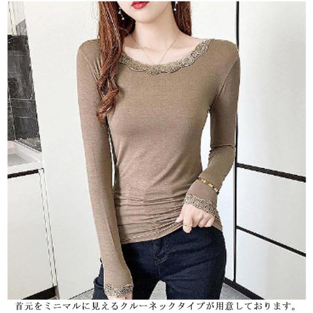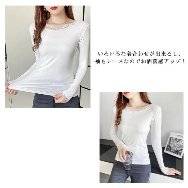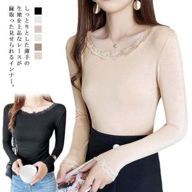 伸縮 ストレッチ 着回し カットソー カットソー クルーネック トップス インナー 薄手 花柄レース 肌着 シンプル 長袖 vネック レースインナー 肌隠し きれいめ 長袖tシャツ 上着 重ね着 レース