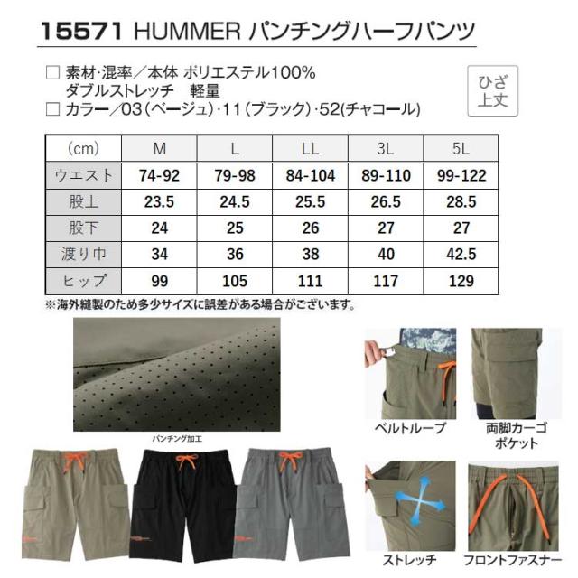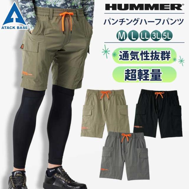 作業服 ハーフパンツ メンズ 作業パンツ 春 夏 軽量 作業着 5L 大きいサイズ 黒 ウエストゴム パンチング ハマー 15571