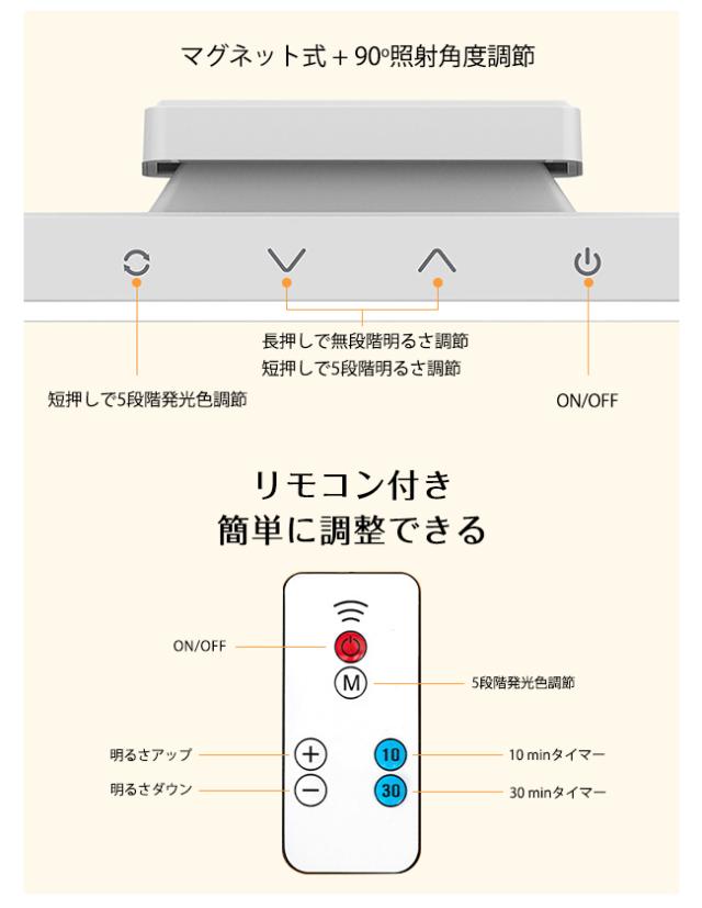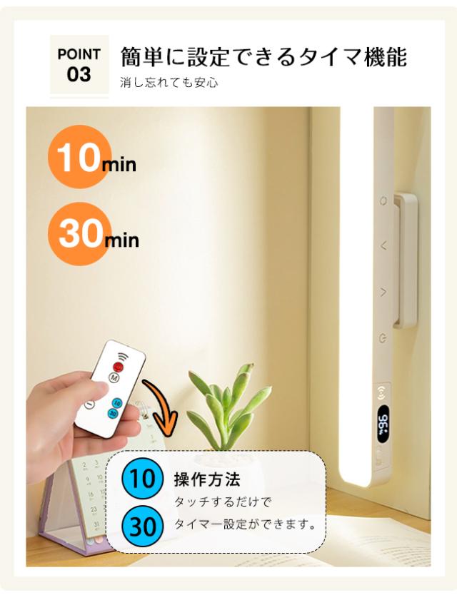 LEDデスクライト タッチセンサー リモコン付き コードレス 充電式 マグネット式 5段階発光色調節 無段階明るさ調節 90度まで照射角度調節 10min 30min タイマー機能 ベッドサイド クロゼット おしゃれ 読書灯 ナイトライト 目に優しい キャンプ 停電 地震 緊急対策 省スペース PC作業 寝室 卓上 取付簡単 テレワーク