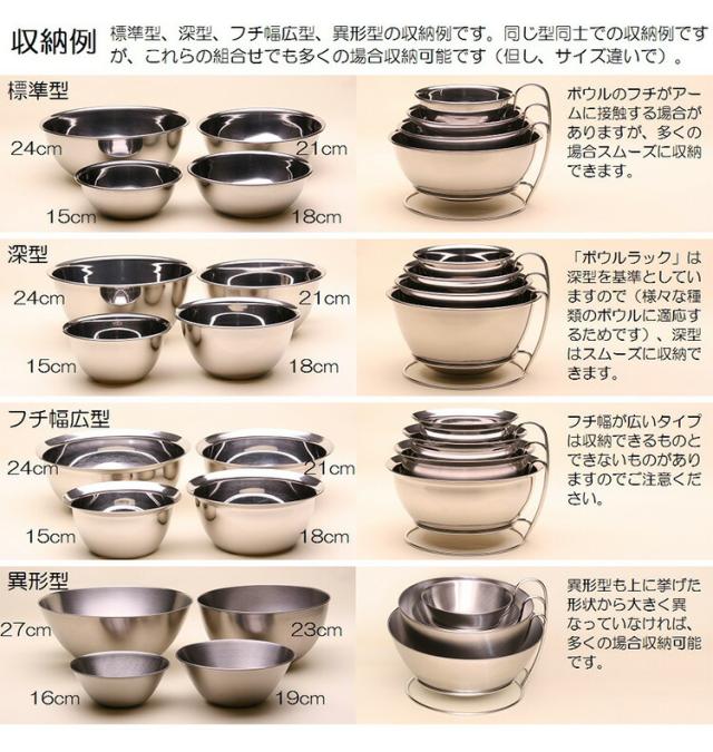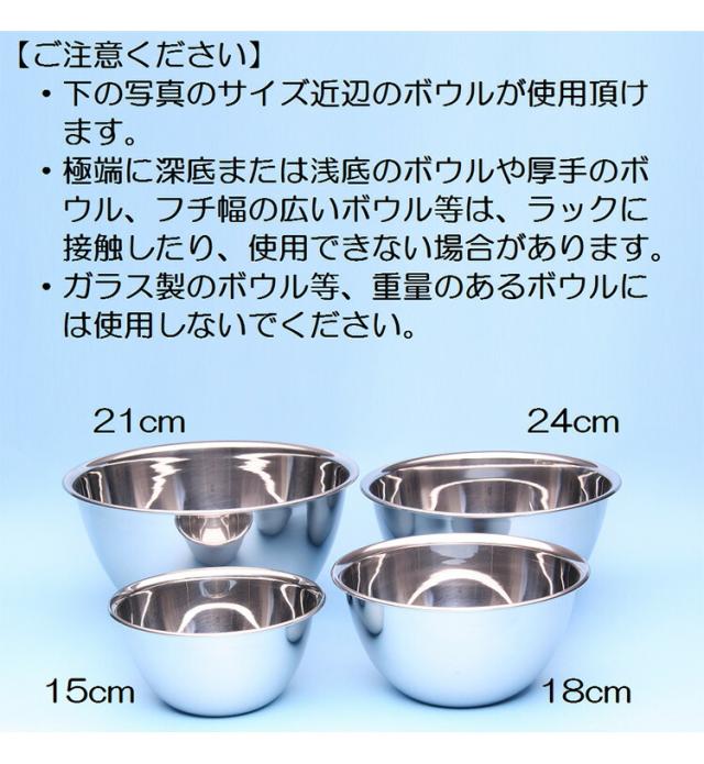 ・本製品は一般的な金属製ボウルを収納するラックです。それ以外の用途には使用しないで下さい。 ・強い衝撃を与えないで下さい。破損や変形の原因になります。 ・破損や変形した状態で使用しないで下さい。ケガをする恐れがあります。 ・火のそばに置かないで下さい。 ・不安定な場所に設置しないで下さい。 ・ボウルの形状によっては、ボウルラックに接触することがあります。 ・ボウルの形状によっては、収納できない場合があります。 その際は新たに収納できるボウルを店頭にてお買い求めいただくか、弊社純正ボウルをお買い求め下さい。 ・収納できないボウルを無理に収納すると、歪んだり破損したりする恐れがあります。 ・ガラス製のボウル等、重量のあるボウルを収納すると、歪んだり破損したりする恐れがあります。 ・本製品を引きずって移動させないで下さい。 ・乳幼児の手の届かないところに保管して下さい。 |