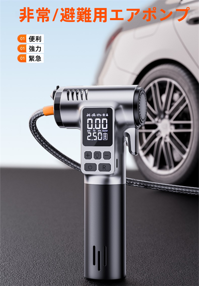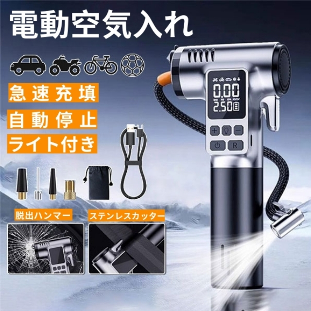 電動空気入れ 電動エアーポンプ 空気入れ 電動 4000mAh 自動停止 脱出ハンマー付き ステンレスカッター付き SOS LEDライト コードレス 仏式 英式 米式 自動車 自転車 バイク空気入れ エアポンプ 小型 コンパクト