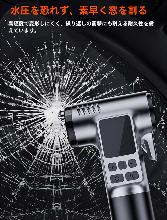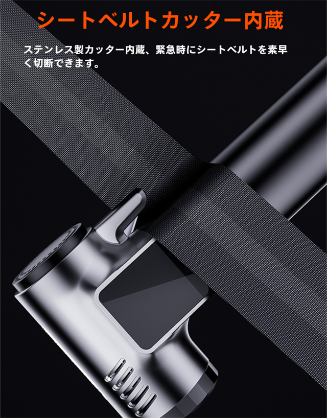 ・非常時には脱出用ハンマーとステンレスカッターが付属しており、緊急時に車内から迅速に脱出できます。また、高輝度LEDライトが搭載されており、夜間の作業や急な停電時にも安心して使用できます。