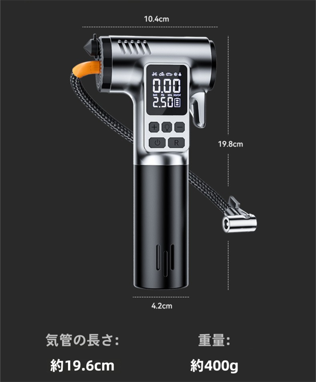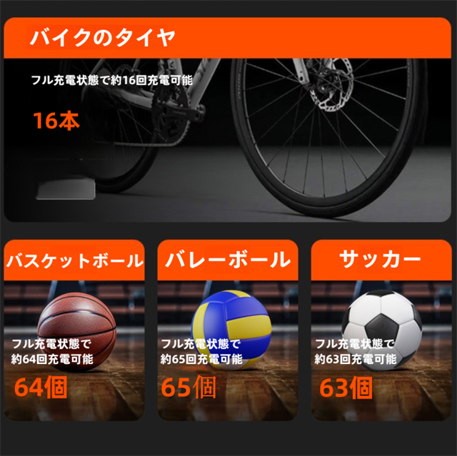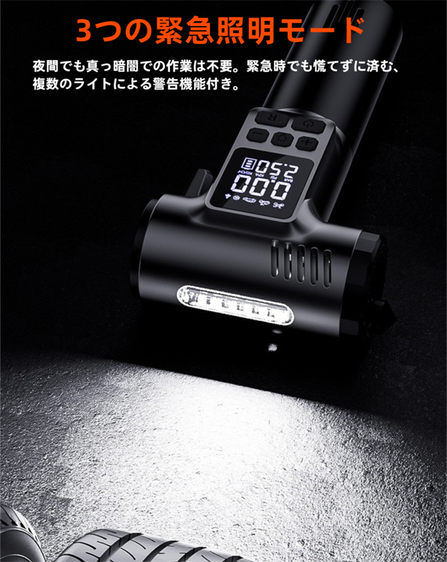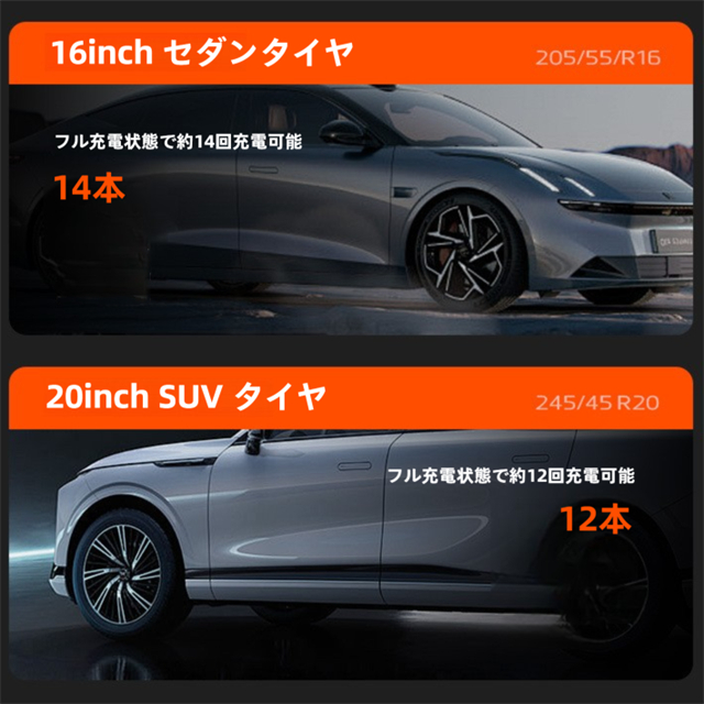 ・内蔵された4000mAhの大容量バッテリーにより、頻繁に充電する必要がなく、1回のフル充電で多数のタイヤに空気を充填できます。