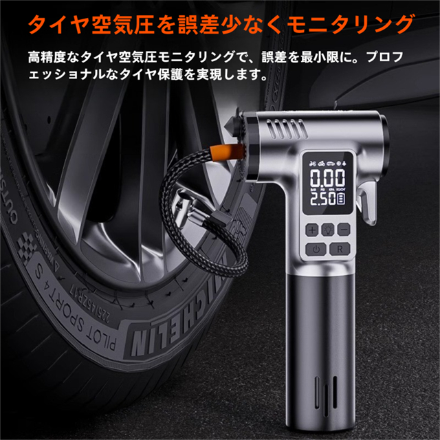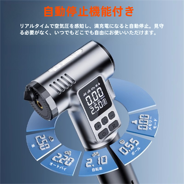 ・タイヤを接続すると自動的に空気圧を検出し、設定した空気圧に達すると自動的に停止します。過剰充填や充填不足の心配はなく、車の横でずっと注意を払っている必要もありません。