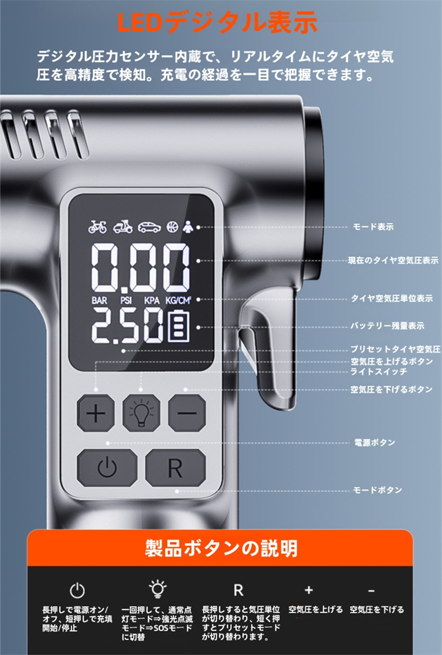 ・毎回最後に使用した設定を記憶するため、次回電源を入れた際には前回使用したモードに設定値を保存します。 ただし、4種類のモードの中で、記憶されるのは最後に使用したモードのみです。他のモード設定は記憶されませんので、次回使用時に再度設定を変更する必要がある場合があります。また、カスタムモードでは、よく使う空気圧値を設定できます。カスタムモードには記憶機能も搭載されており、前回設定した値を記憶します。