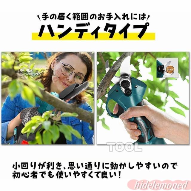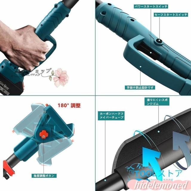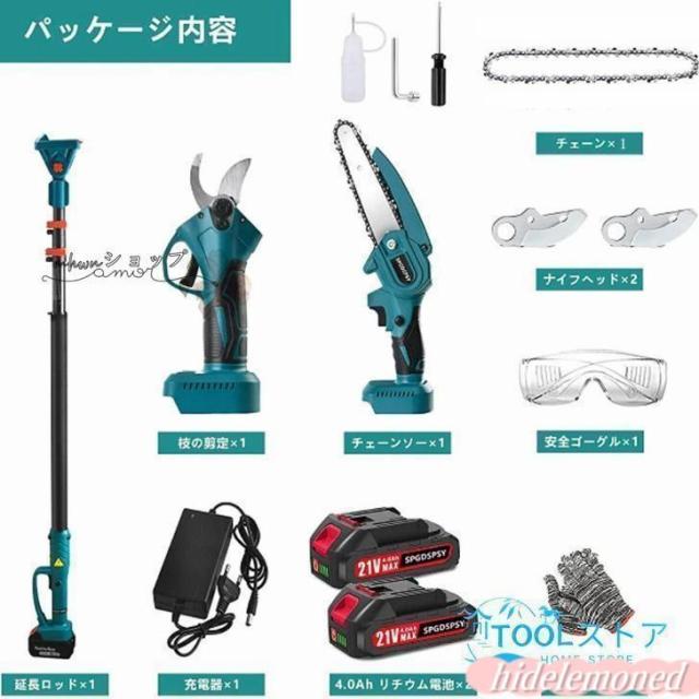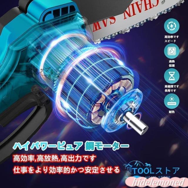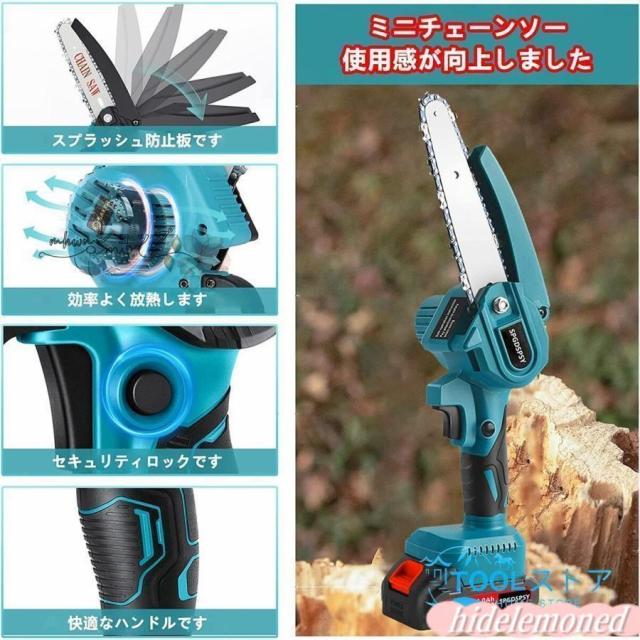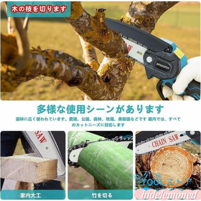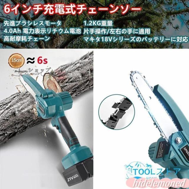 チェーンソー:6インチ、高耐摩耗チェーン搭載。直径15cmの幹も約6秒切断。21Vmax銅芯モーターで強力パワー。