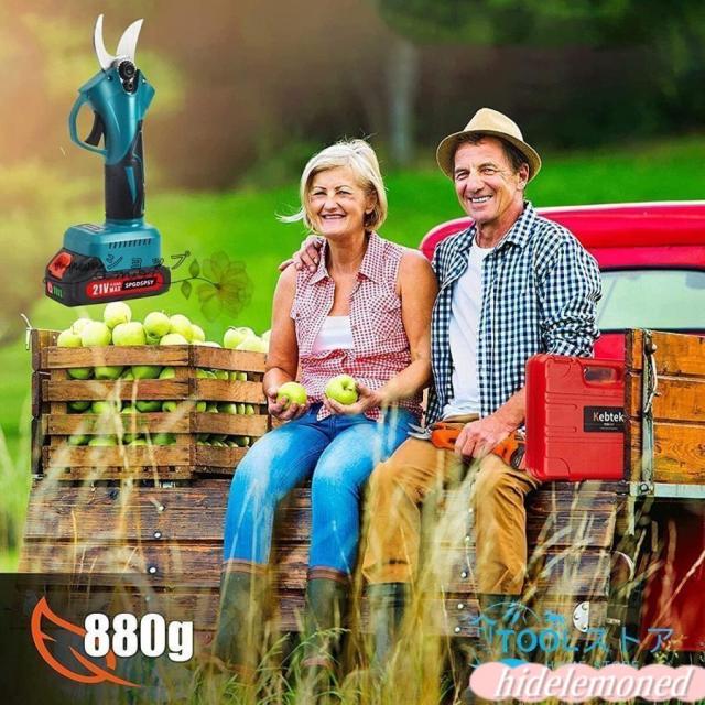 4.0Ah大容量リチウムバッテリー付属。充電時間約2〜3時間。本体重量は剪定バサミ約880g、チェーンソー約1.2kgと軽量で、女性でも片手で楽々操作できます。