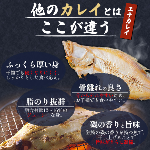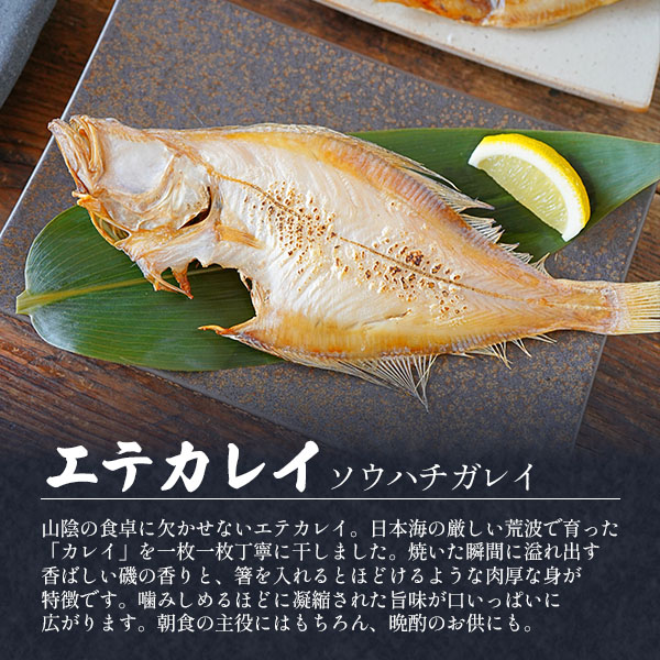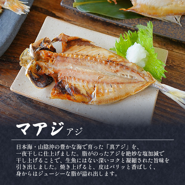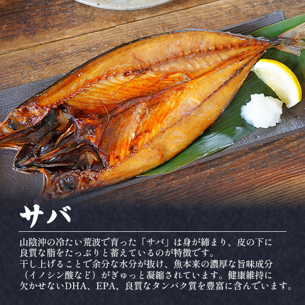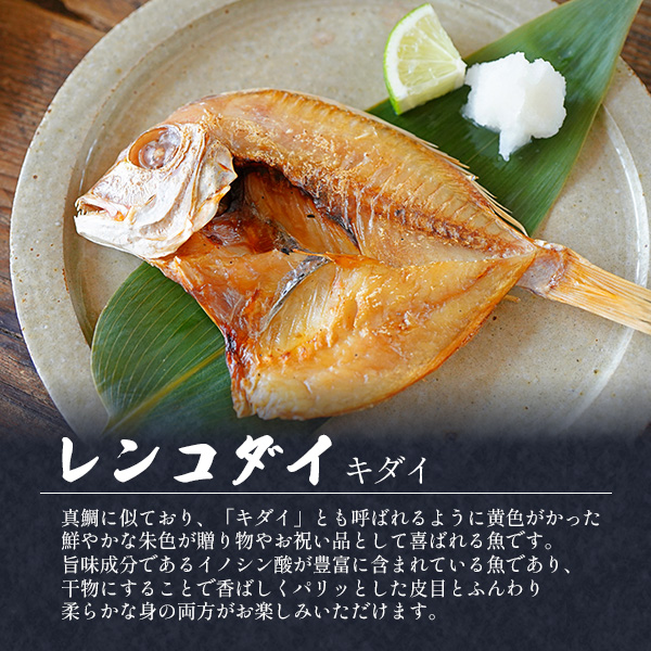 のどぐろ開き、あじ開き、えてかれい干し 各70〜100g、レンコダイ開き100〜150g、サバ開き150〜200g