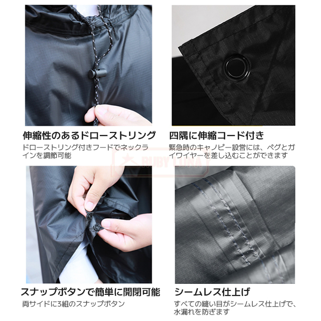 | 【防水レインコート】 | ◆210Tポリエステル生地を採用していて表地はPUコーディングされています、防水性バッチです。強化した表地は引き裂き防止で耐久です。 |