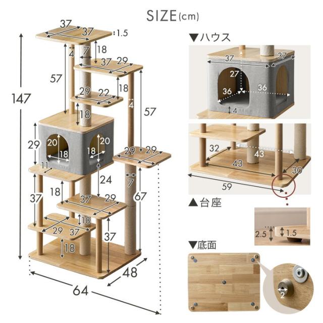 【本日P5%還元】 【予約/新発売プライス!5/10迄】 天然木 キャットタワー 木製 147cm 据え置き 爪とぎ 猫タワー キャット タワー 置き型 多頭飼い 綿紐 ネコ ねこ 猫 大型猫 キャットハウス 猫ハウス キャットツリー 木 遊び場 隠れ家付き 運動 省スペース スリム おしゃれ