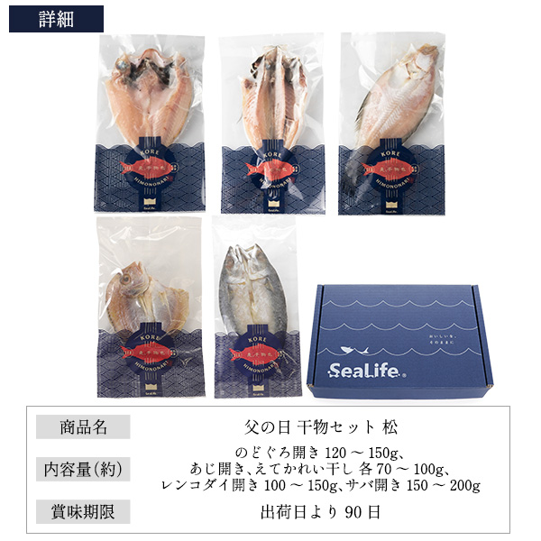 のどぐろ開き120g〜150g、あじ開き、えてかれい干し 各70〜100g、レンコダイ開き100〜150g、サバ開き150〜200g