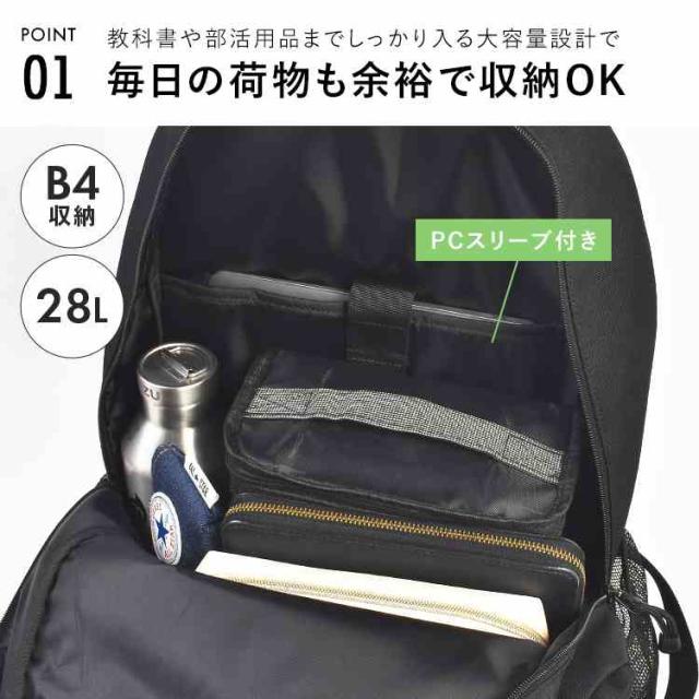 28Lの大容量&B4対応で、教科書・ノート・PCまでしっかり収納。