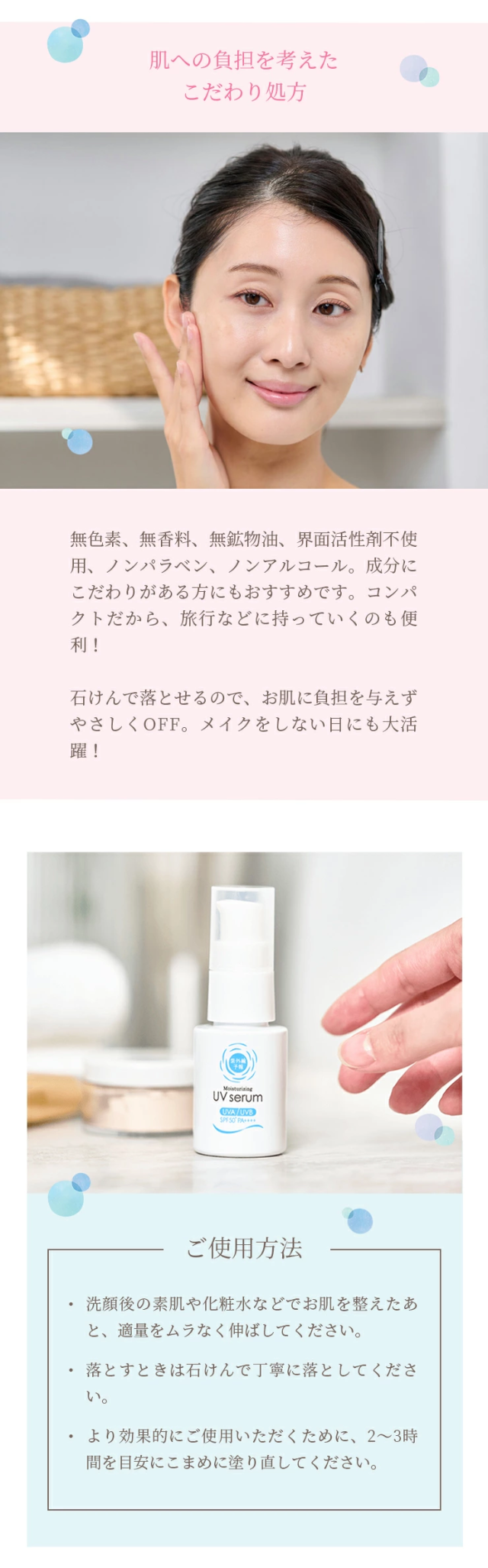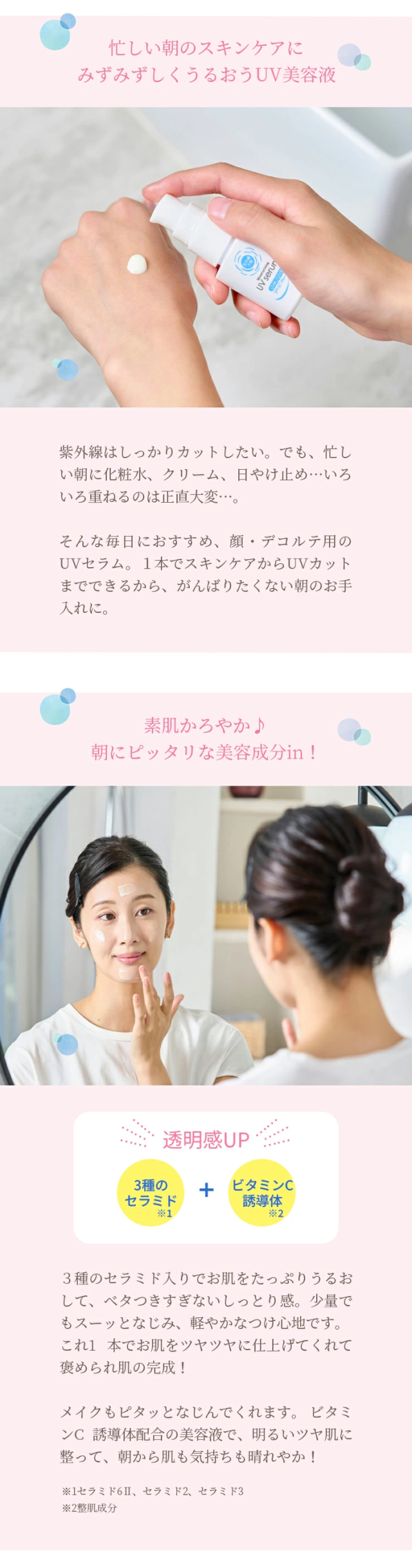 | 洗顔のあとこれ1本でスキンケア〜UVカットが完了するUV美容液。ベタつかず、しっとりした肌に整えます。 紫外線はしっかりカットしたい。でも、忙しい朝に化粧水、クリーム、日やけ止め…いろいろ重ねるのは正直大変…。 そんな毎日におすすめ、顔・デコルテ用のUVセラム。1本でスキンケアからUVカットまでできるから、がんばりたくない朝のお手入れに。 3種のセラミド入りでお肌をたっぷりうるおして、ベタつきすぎないしっとり感。少量でもスーッとなじみ、軽やかなつけ心地です。 これ1 本でお肌をツヤツヤに仕上げてくれて褒められ肌の完成! メイクもピタッとなじんでくれます。 ビタミンC 誘導体配合の美容液で、明るいツヤ肌に整って、朝から肌も気持ちも晴れやか! ・顔・デコルテ用 ・SPF50+ PA++++ ・石けんで落とせます ・無色素、無香料、無鉱物油、ノンパラベン、ノンアルコール ・洗顔後、これ1本でスキンケア&UVケア完了! ・カサつく肌のうるおい守る!アルブチン・コラーゲン・ヒアルロン酸・7種の植物エキス配合 ・うるおいkeepする3種のセラミド、透明感upするビタミンC誘導体(整肌成分)配合 ・オレンジ精油の香り ・コンパクトで旅行などに持っていくのも便利 ・メイクをしない日にも大活躍! 【使用期限】未開封3年、開封後6ヶ月を目安にお使いください。 |