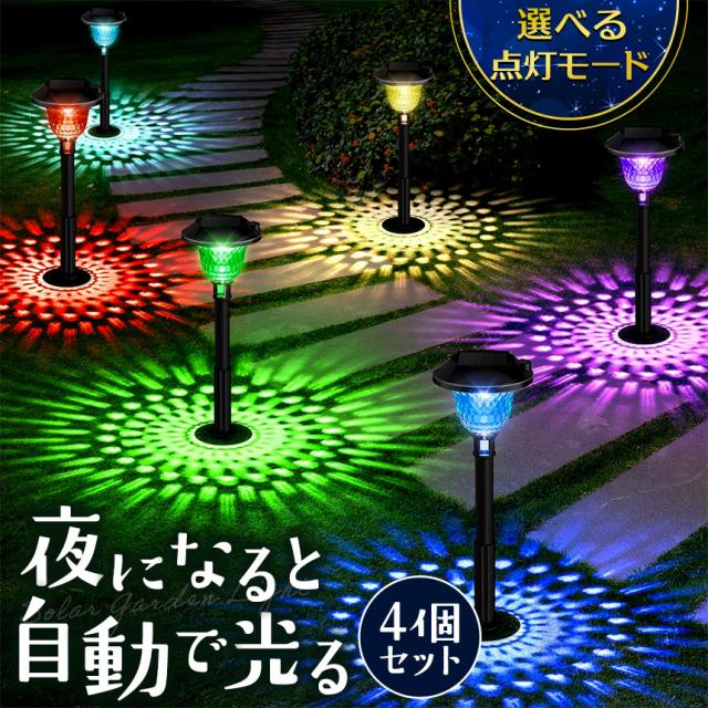 ソーラーライト 4個セット ガーデンライト 屋外 防水 長時間 おしゃれ ライトアップ LED イルミネーション 自動点灯 太陽光充電 埋め込み 挿し込み 庭 玄関 芝生 花壇 照明 電気代0円 トーチライト カラフル ライト 幻想的 かわいい 綺麗 センサー 電球色