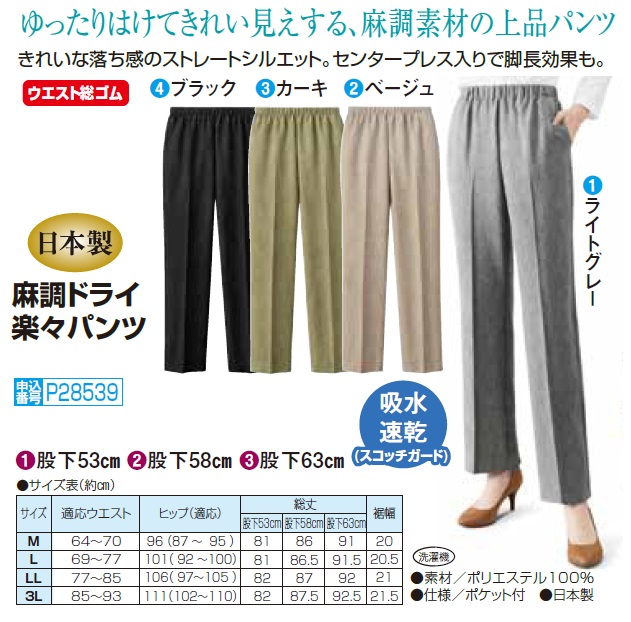 日本製 麻調ドライ楽々パンツ 全4色 選べる股下丈 イージーパンツ センタープレス ストレートパンツ レディース 婦人服 ミセス シニア 女性 大人 グレー ベージュ カーキ ブラック 吸水速乾 無地 シンプル シニアファッション 40代 50代 60代 70代 80代 90代 母の日 お母さん おばあちゃん 春物 夏物 春夏 センタープレスパンツ スラックス ウエストゴム スコッチガード ズボン 裾上げ済み