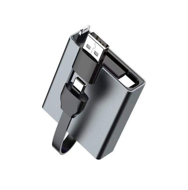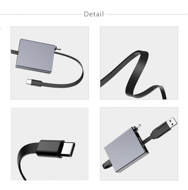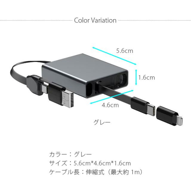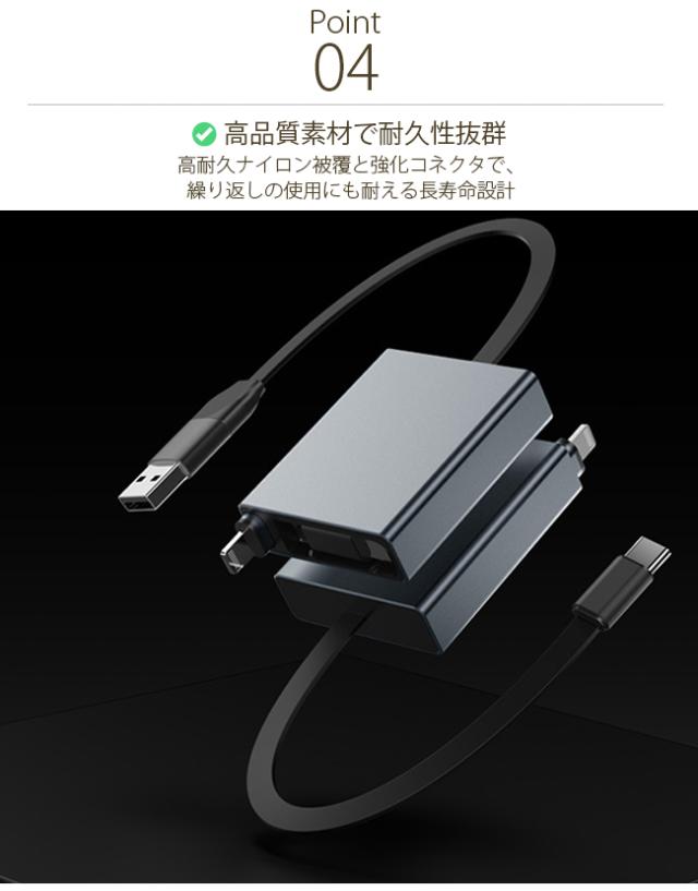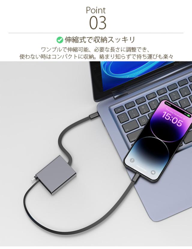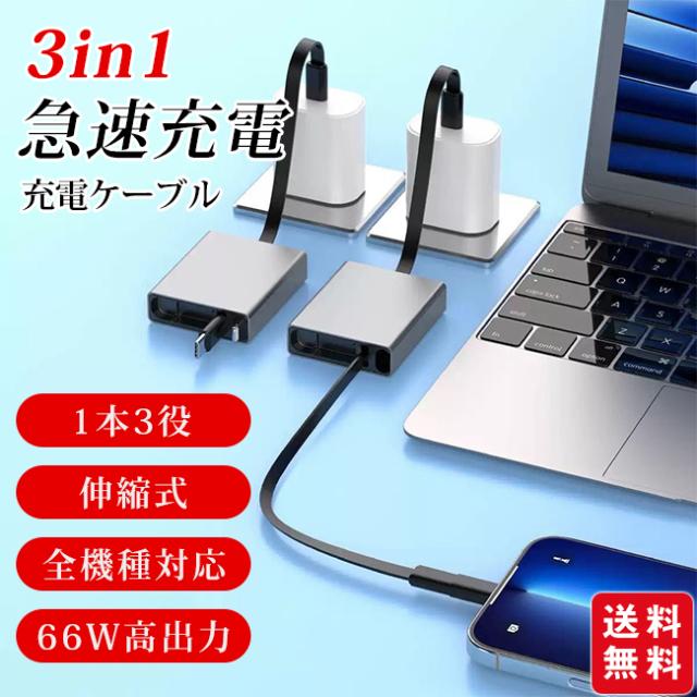 3in1 伸縮式 充電ケーブル Type-C/Lightning/USB-A 66W 急速充電 ケーブル 収納式 1 本 3 役 スマホ / タブレット / ノート PC 対応 持ち運び便利