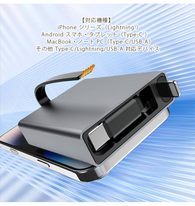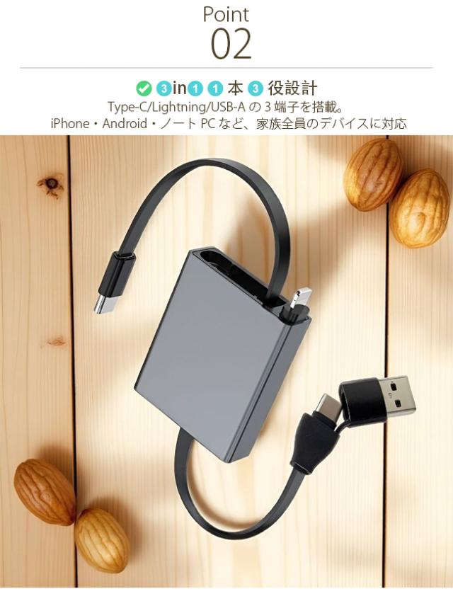 ? 3in1 1 本 3 役設計:Type-C/Lightning/USB-A の 3 端子を搭載。iPhone・Android・ノート PC など、家族全員のデバイスに対応