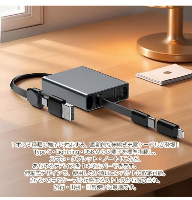 3in1 充電ケーブル、伸縮式 充電ケーブル、収納式 充電ケーブル、66W 急速充電ケーブル、Type-C 充電ケーブル、Lightning 充電ケーブル、USB-A 充電ケーブル 1 本 3 役 充電ケーブル、多機能 充電ケーブル、スマホ 充電ケーブル、ノート PC 充電ケーブル、持ち運び 充電ケーブル、出張 充電ケーブル、旅行 充電ケーブル、カバン すっきり ケーブル、絡まらない 充電ケーブル、急速充電 対応 ケーブル、PD 充電 対応 ケーブル