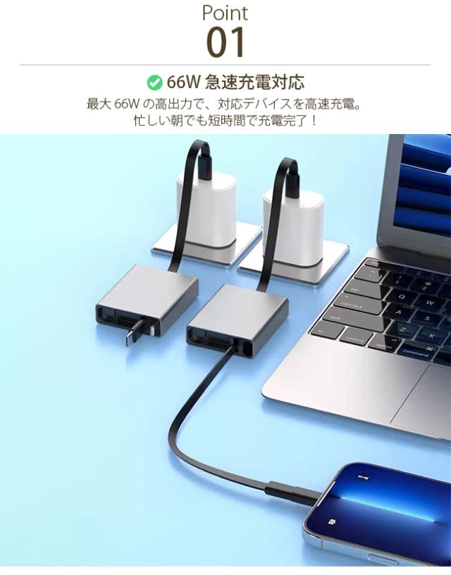 ? 66W 急速充電対応:最大 66W の高出力で、対応デバイスを高速充電。忙しい朝でも短時間で充電完了!