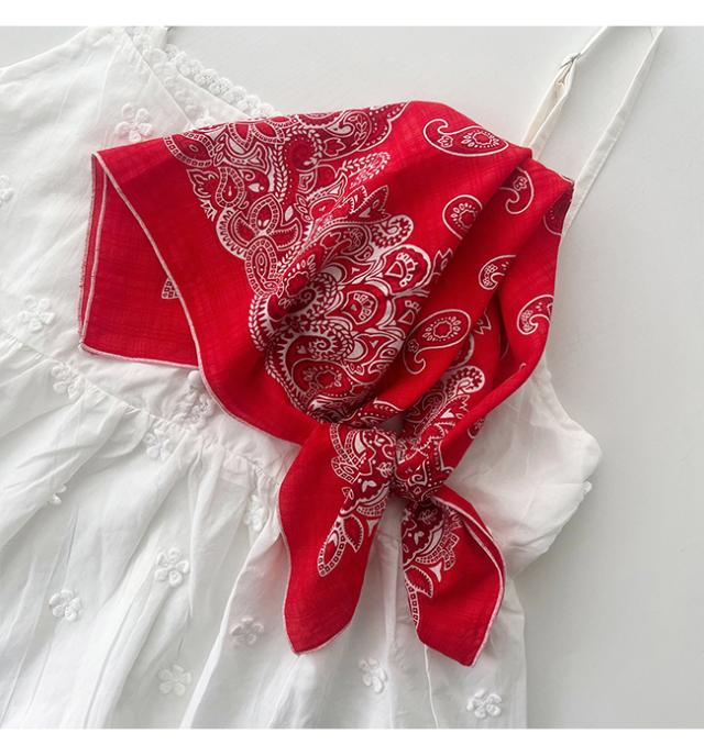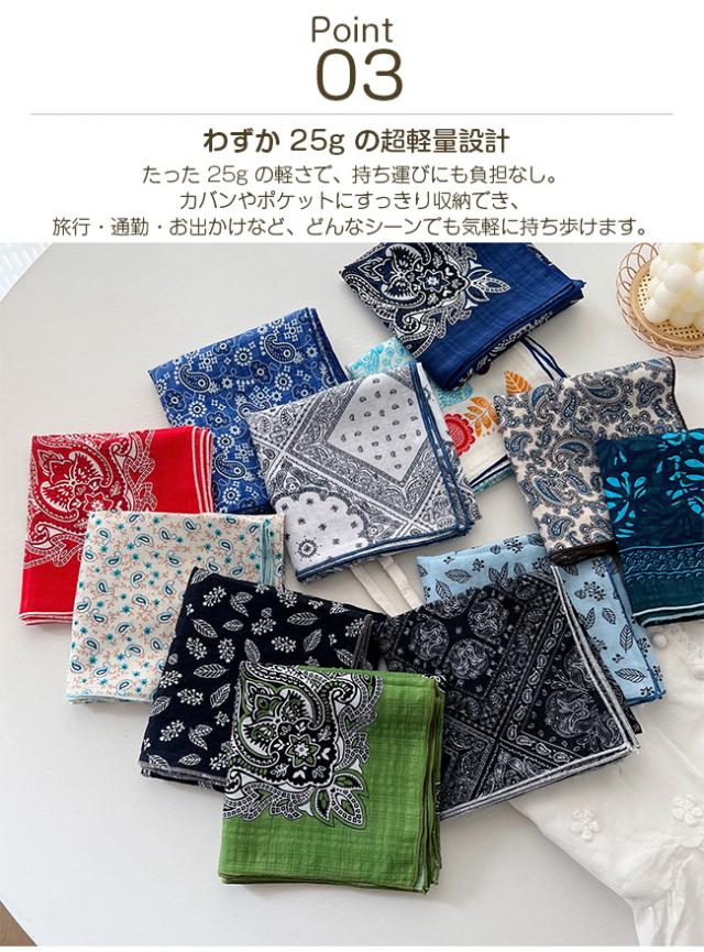 わずか 25g の超軽量設計で、首元に巻いても負担が少なく、ネッカチーフとしてはもちろん、ヘアバンド・ヘアターバン、バッグチャームなどマルチに使える万能アイテム。