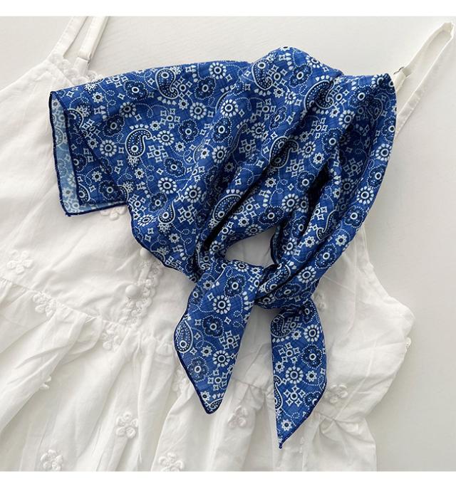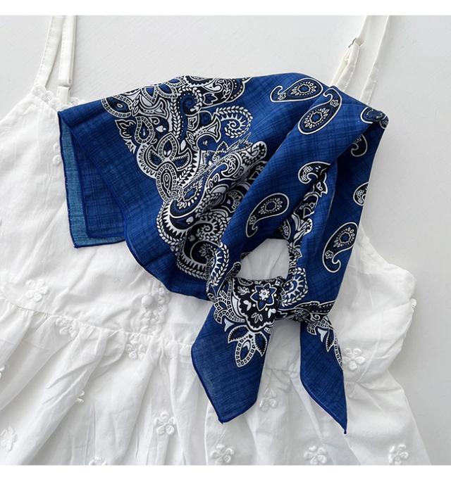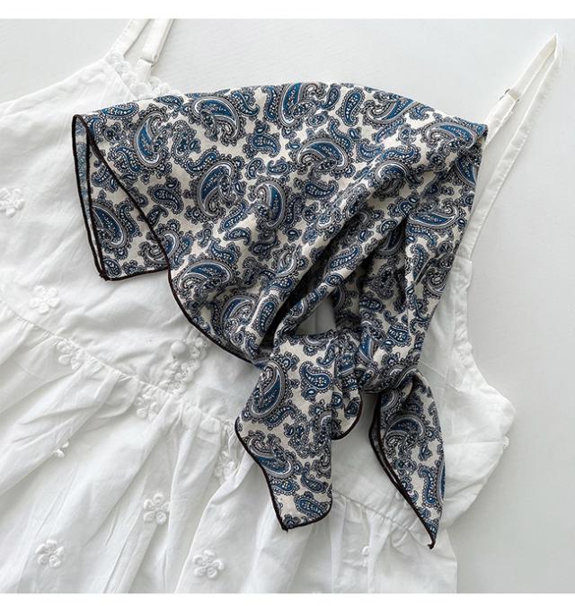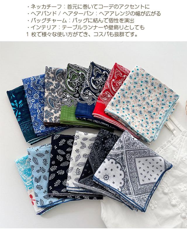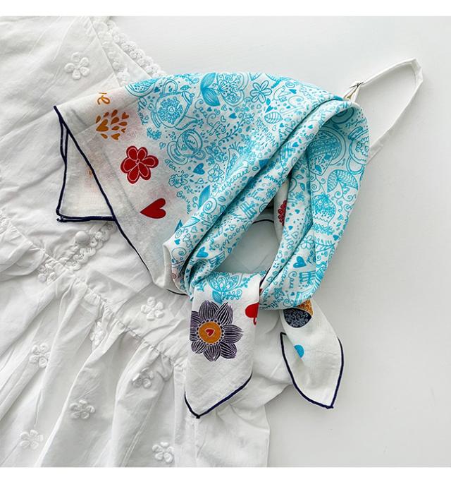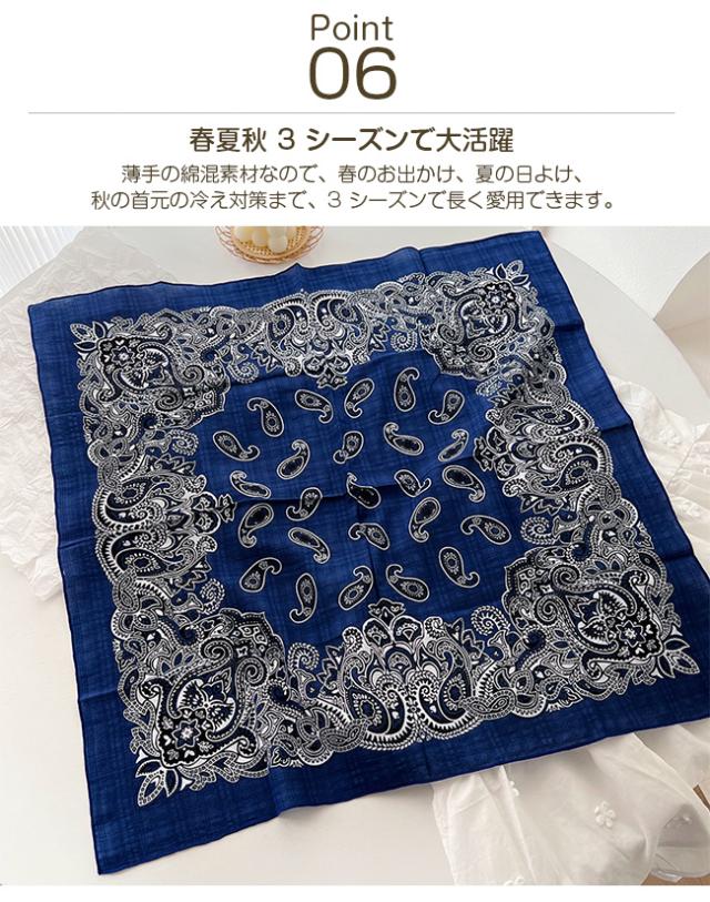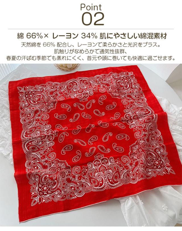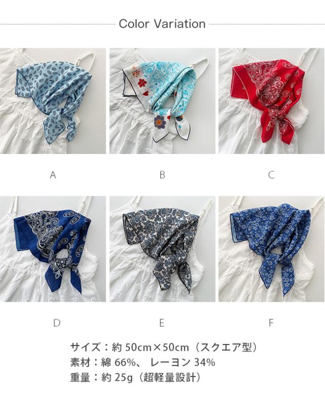 レトロな花柄とヴィンテージ感あふれるデザインが魅力的な、綿 66%× レーヨン 34% の綿混素材スクエアスカーフです。