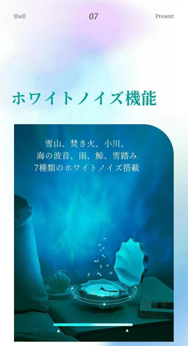 ホワイトノイズ機能: 雨の音、海の波音など7種類のホワイトノイズがあります。快眠やリラックスに最適。自然の音のような穏やかなサウンドで、心身を落ち着けます。