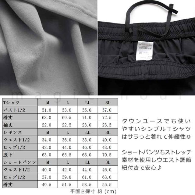 平置き実寸(約) M Tシャツ: 身幅 51cm, 着丈 68cm レギンス: ウエスト 34cm, 股下 63cm ショートパンツ: ウエスト 40cm, 着丈49.5cm L Tシャツ: 身幅 53cm, 着丈 69.5cm レギンス: ウエスト 36cm, 股下 65.5cm ショートパンツ: ウエスト 42cm, 着丈51.5cm LL Tシャツ: 身幅 55cm, 着丈 71cm レギンス: ウエスト 38cm, 股下 68cm ショートパンツ: ウエスト 42cm, 着丈53.5cm 3L Tシャツ: 身幅 57cm, 着丈 72.5cm レギンス: ウエスト 40cm, 股下 70.5cm ショートパンツ: ウエスト 46cm, 着丈55.5cm |