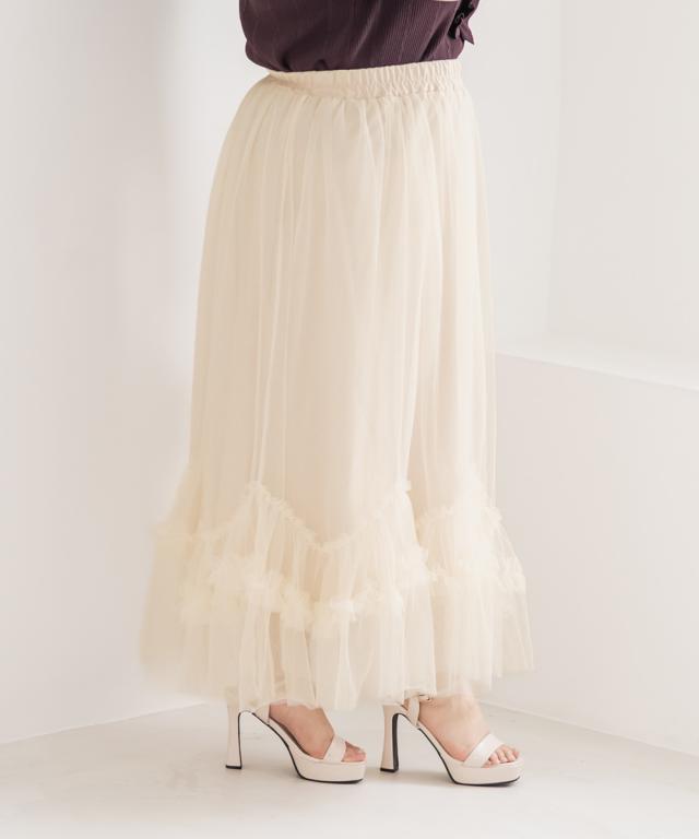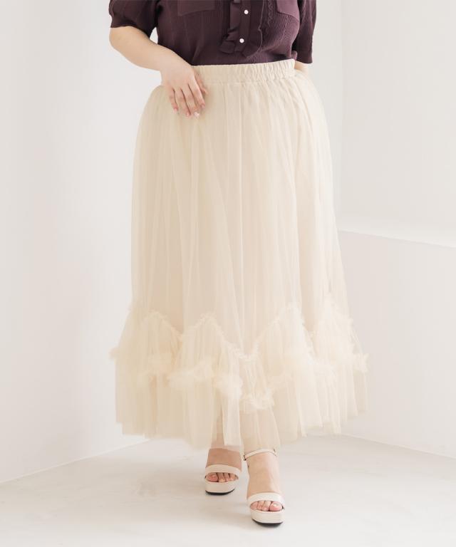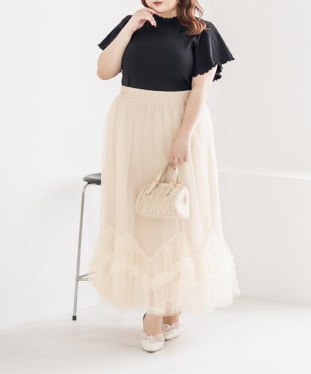 | 3Lサイズを着用してちょうどいいサイズ感でした!ウェーブ状のフリルとチュールが重なって、動くたびにふんわり揺れる華やかなデザインが可愛いです◎ボリューム感がありながらも広がりすぎず、すっきり見えするシルエットでバランスよく着られました♪ウエストも楽な穿き心地でストレスなく、コーデの主役になる一枚です! |