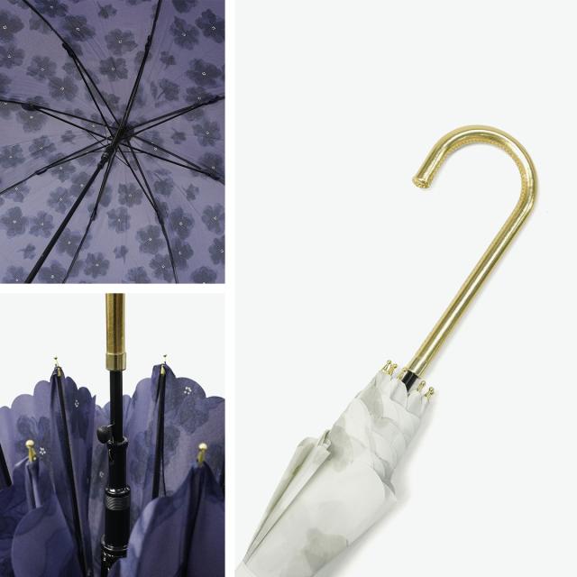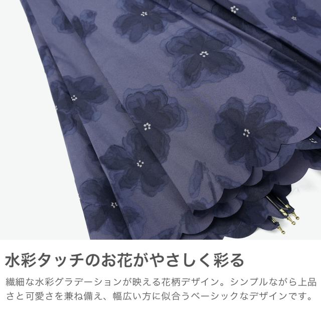 繊細なグラデーションで描かれた水彩タッチの花柄が魅力の長傘です。 晴雨兼用でUVカット機能も備えているため、雨の日はもちろん、日差しが気になる日にも活躍します。主張しすぎない上品なデザインで、年齢やスタイルを問わず幅広い方にお使いいただけます。ふちがスカラップデザインになっているのもさりげないポイント。シンプルさの中に可愛らしさを添えた、日常にすっと馴染むアイテムです。