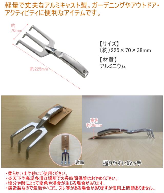・柔らかい土や砂にご使用ください。 ・軍手や手袋を装着してのお使いをおすすめします。 ・アルミニウムは熱伝導率の高い素材です。炎天下や高温多湿な場所での長時間保管はおやめください。 ・塩分や酸によって変色や浸食が生じる場合があります。 ・鋳造製なので気泡やヘコミがある場合があります。 ・火の側で使用しないでください。 |