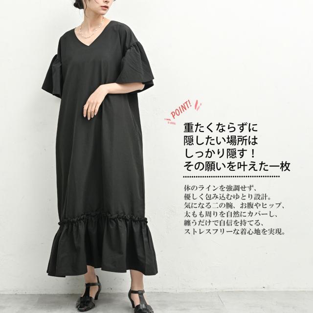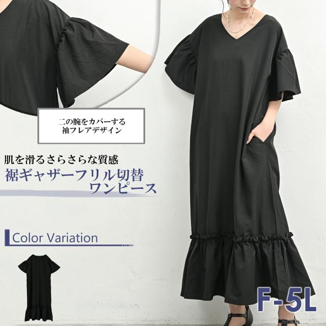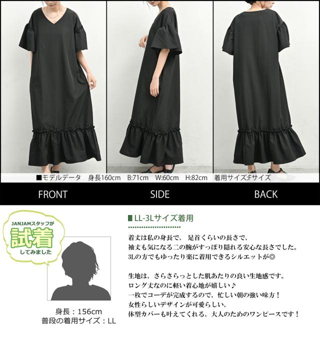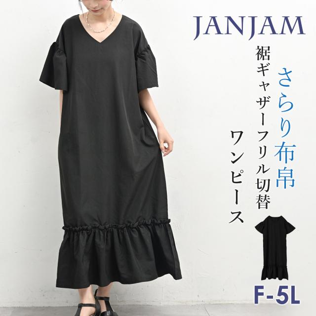 【JANJAM夏の洗練ブラックワンピ】ギャザーフリルワンピース Aラインワンピース 切り替えワンピース 楽ちんワンピ 無地 ロング丈 マキシ丈 アンクル丈 足首丈 Vネック 5分袖 五分袖 半袖 フリルスリーブ フレアスリーブ 切り替え 布帛 サラサラ ポケット Aライン ゆったりシルエット 春服 夏服 春物 夏物 春ワンピース 夏ワンピース 伸びない 透けない 裏地なし 着痩せ 細見え ゆったり 大きめ 体型カバー 体型カバー服 お腹カバー ヒップカバー JANJAM ジャンジャン ジャンジャム 大きい サイズ プラス ぽっちゃり プラスサイズ 体型 カバー 大人 カジュアル フェミニン ナチュラル きれいめカジュアル 大人カジュアル シンプル 上品 デイリーワンピース 時短アイテム カジュアルワンピース 大人可愛い きれいめ キレイ目 綺麗め かわいい 可愛い かっこいい 着こなし おしゃれ 定番 春コーデ 夏コーデ 女子会 デート ファッション 大きめ 女性 婦人 女性用 婦人用 ミセス 30代 40代 50代 2026 春新作 春 夏 黒 ブラック F LL 3L 4L 5L 2L XL XXL XXXL XXXXL 2XL 3XL 4XL 9号 13号 15号 17号 19号