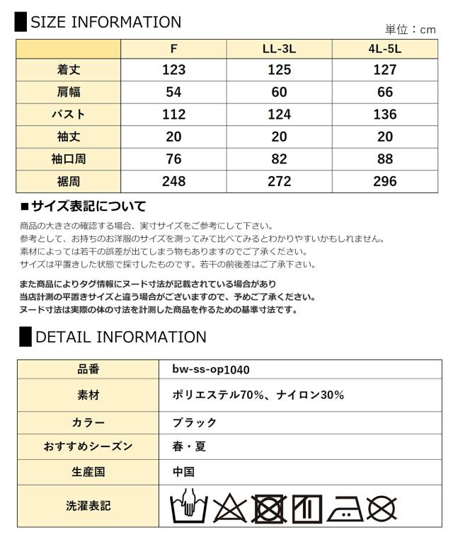 4L-5L:着丈127 肩幅66 バスト136 袖丈20 袖口周88 裾周296
