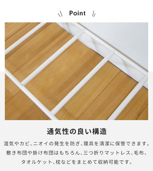 | ・布団の出し入れがしやすい布団収納ラック ・敷き布団、掛け布団、マットレスなどまとめて収納可能 ・通気性の良い構造で湿気対策 ・棚位置調整で多用途収納 ・移動に便利なキャスター付き ・押入れやクローゼット収納に最適 |