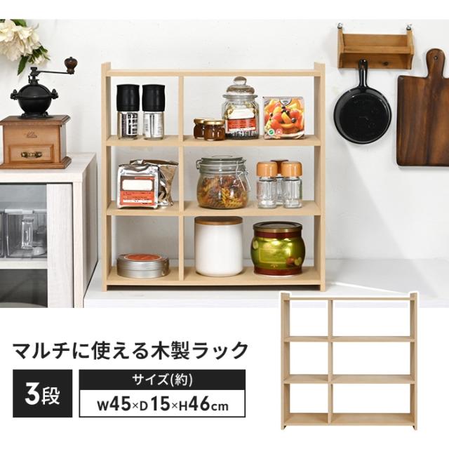 卓上収納ラック 3段 日本製 幅45 奥行15 高さ46 木製ラック オープンラック 卓上ラック スパイスラック 調味料ラック 小物収納 ディスプレイラック 卓上棚 キッチンラック コスメ収納 文房具 CD ナチュラル おしゃれ 収納棚 新生活 一人暮らし
